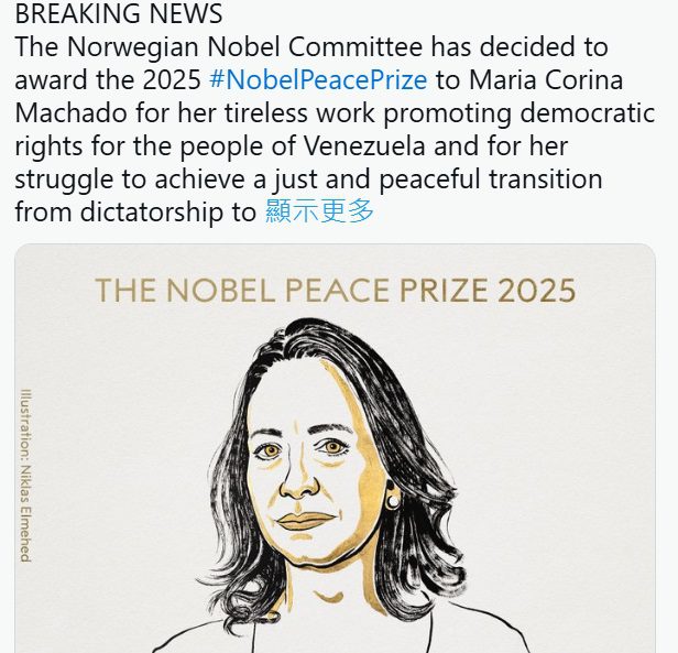 綜合報導/2025諾貝爾和平獎(Nobel Peace Prize)揭曉,來自委內瑞拉的政治家馬查多(Maria Corina Machado)雀屏中選,諾貝爾委員會表示這是為了表彰馬查多替委內瑞拉人民爭取民主權利所做的不懈努力,以及為實現從獨裁到民主的公正和平轉型所做的奮鬥。