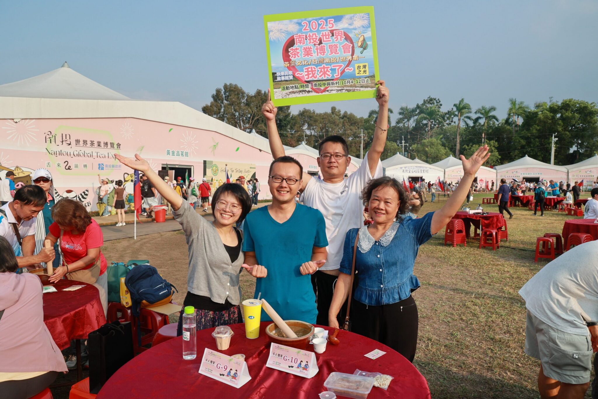 茶博會今年最特別,喝擂茶,為國家慶生外,晚上還可以看國慶焰火;千人擂茶現場,有呼朋引伴的民眾,聚在一起擂茶;也有一家大小出遊,在中興新村大操場上,做擂茶,沖泡後飲用,自在聊天,度過悠閒的下午。