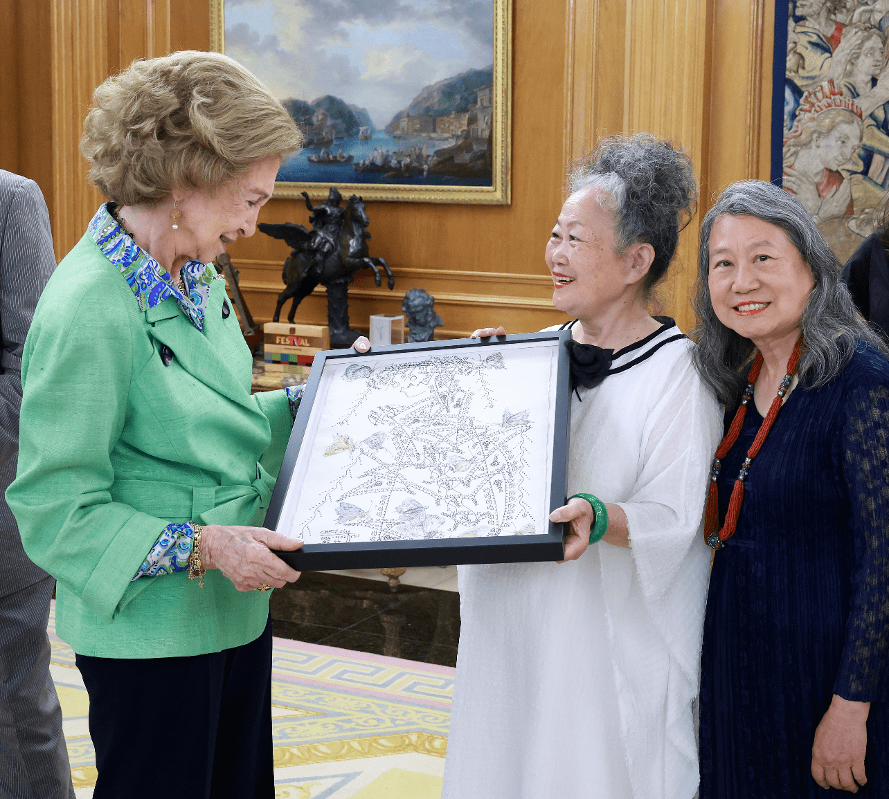 原由是去年2024年2月,新竹藝術家朱麗麗受曾得諾貝爾文學獎的Camilo José Cera 大名命名的卡米洛·何塞·塞拉大學校長Fernando de Saavedra之邀,為西班牙1906年諾貝爾獎醫學獎得主 聖地牙哥•拉夢•卡哈(Santiago Ramón y Cajal) 傳記《發現卡哈》(Descubriendo a Cajal)一書配圖,她用最拿手的墨線畫,精心為這本書設計《魂化蝶,婆娑繞舞在新潮女人旁》(Mariposas del alma volando alrededor de la mujer moderna),獲得西班牙藝術界與醫學界一致高度讚賞與肯定,充滿東方文化內涵的靈氣新潮女人造型,亦獲取西班牙的克魯斯•愛蓮娜美術館館長Mercedes Gorbacho Rodríguez賞識,邀請其前往展出;更獲得西班牙太后La reina Sofía特別讚賞,收藏她的這件墨線畫。