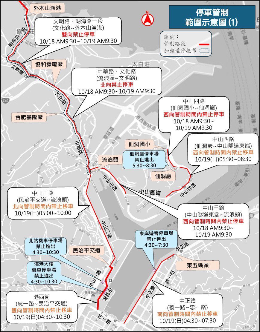 停車管制方面,自10月18日(六)上午9時30分至10月19日(日)上午9時30分,中華路、文化路往外木山方向禁止路邊停車,跑道全線道路之禁停紅線路段加強實施拖吊;活動當日道路管制路段,路邊車輛及停車場皆禁止移車。造成民眾不便,敬請見諒!建議市民朋友多搭乘大眾運輸工具,共同支持基隆城市馬拉松活動。