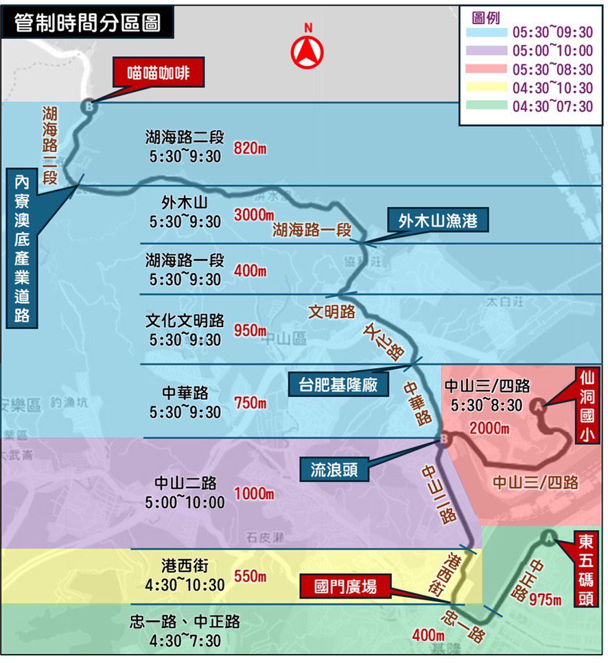 活動當日上午4時30分至7時30分將封閉市區中正路往車站方向全線、忠一路往車站方向封閉2車道;港西街則自上午4時30分至10時30分進行全段封閉;中山二路往外木山方向於上午5時至10時分隔島右側車道封閉,中山三、四路往市區方向於上午5時30分至8時30分車道縮減,保留1車道通行、中山隧道封閉;中華路、文化路、文明路往外木山方向於上午5時30分至9時30分車道縮減,保留1車道通行;湖海路於上午5時30分至9時30分市區到外木山漁港區間採單線雙向管制、過外木山漁港到喵喵咖啡則進行全段禁行管制。請用路人提前改道行駛,並請遵守管制人員之指揮疏導,共同維護行車安全。