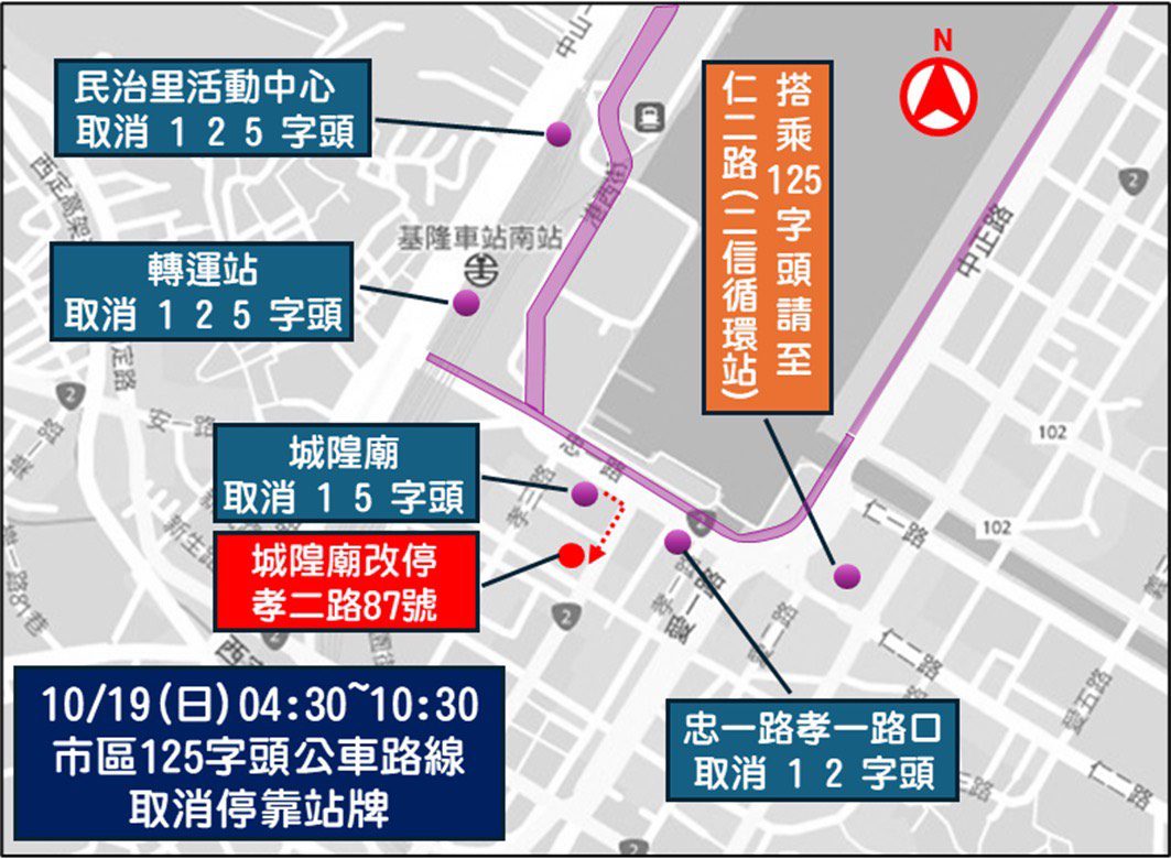 交通管制期間上午4時30分至10時30分,計程車及轉運站臨停上下客區將調整至忠一路火車站南站旁路段之外側車道,轉運站市公車1字頭、2字頭、5字頭取消停靠,含忠一路孝一路路口站、民治里活動中心站,皆改至仁二路二信循環站搭乘,城隍廟站牌遷移至孝二路87號;上午5時至10時中山二路往外木山方向市公車301、312及客運1813D等路線,站牌將調整停靠位置,請乘車民眾多加留意。