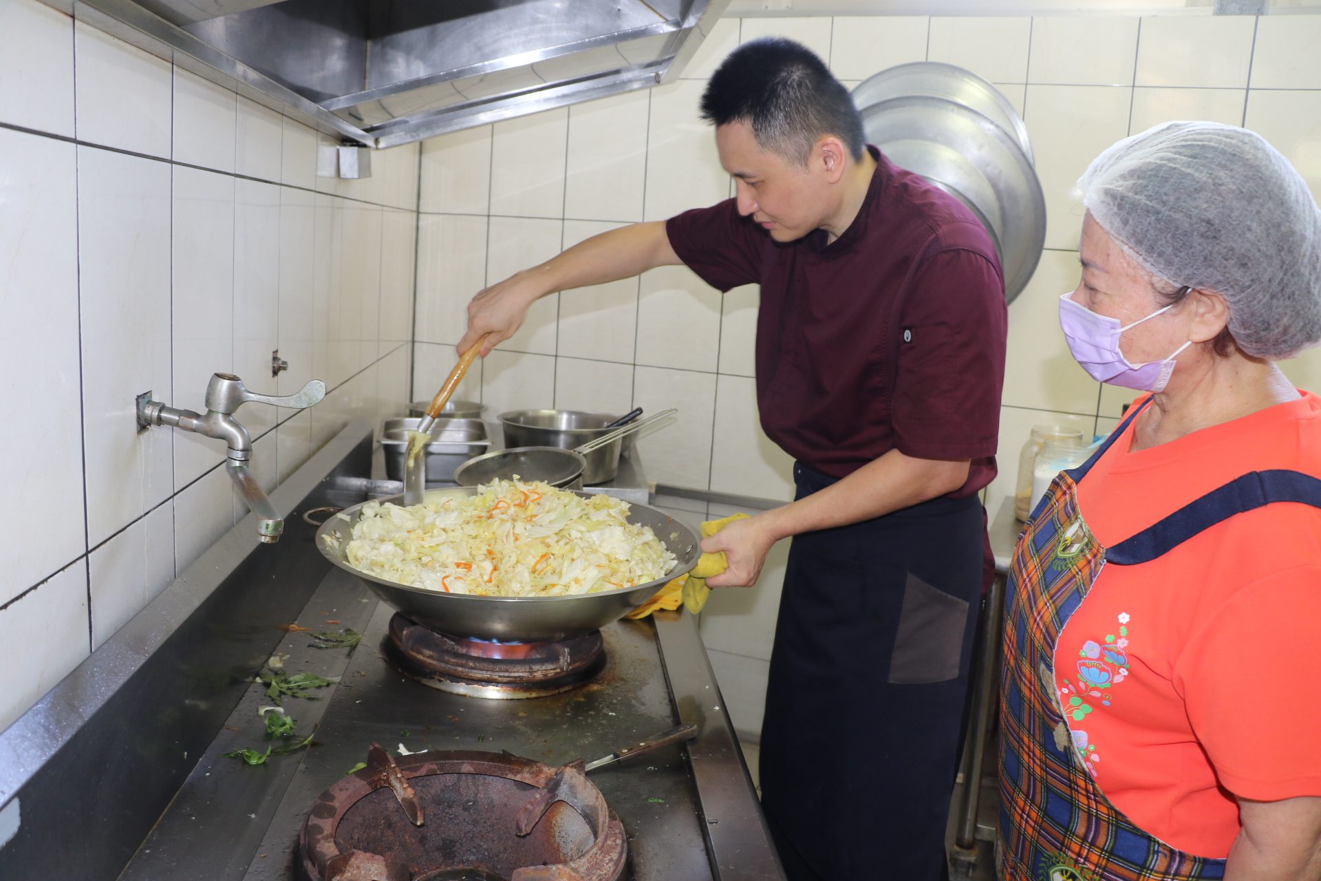 為減少食物浪費並擴大社區服務能量,新北市社會局設立「惜食分享廚房」,並連結義廚提供服務。曾任五星級飯店主廚的陳佳瑋從107年起多次響應,今(15)日再度利用個人休假時間,專程從台中麗寶福容飯店開車北上,到新莊牡丹心社區發展協會照顧關懷據點為長輩義煮,平時為長輩煮飯的志工媽媽圍繞著陳佳瑋,他也不藏私,將一些做菜的秘訣分享。長輩在動健康後一起共餐,享用精緻美味的料理。
