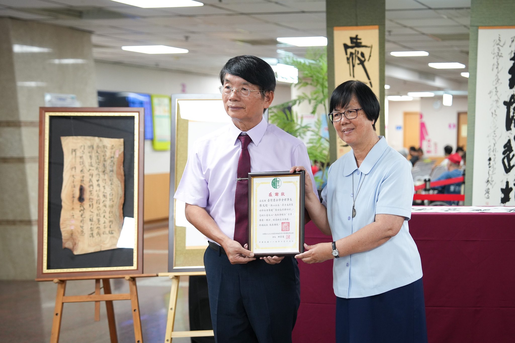 臺灣書法學會前理事長廖火煌親自捐贈義賣所得新台幣七十萬元予聖功修女會。(記者王承綸/翻攝)