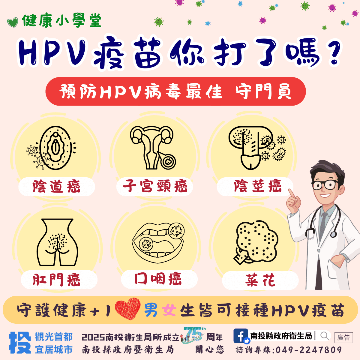 南投縣政府衛生局自2018年起推動國中女生公費接種HPV疫苗。然而,過去因HPV疫苗常被稱為「子宮頸癌疫苗」,導致社會大眾誤以為僅女性需要接種、僅能預防子宮頸癌。事實上,男性同樣面臨感染人類乳突病毒(HPV)之風險,人類乳突病毒會感染人體的表皮與黏膜組織,是常見且重要的傳染病之一。我國常見的HPV高危險型為第16、18、52、58型,與子宮頸癌前病變、子宮頸癌、人類外生器癌及頭頸癌(包括口咽癌)等疾病均有密切關聯。