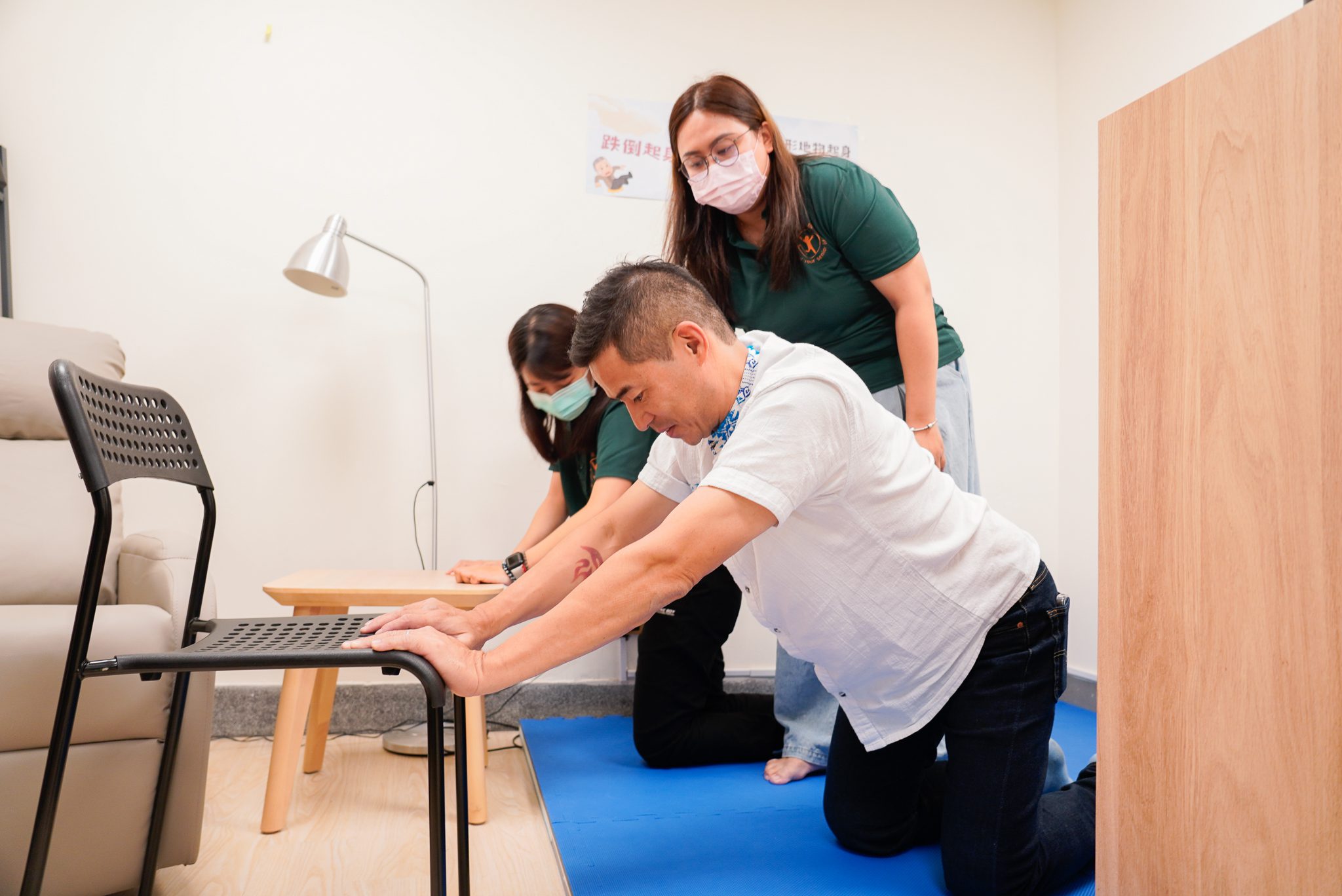 家庭照顧者在專業人員(著綠衣者)指導下,演練老人跌倒後要如何攙扶椅子安全起身。(新北市社會局提供)