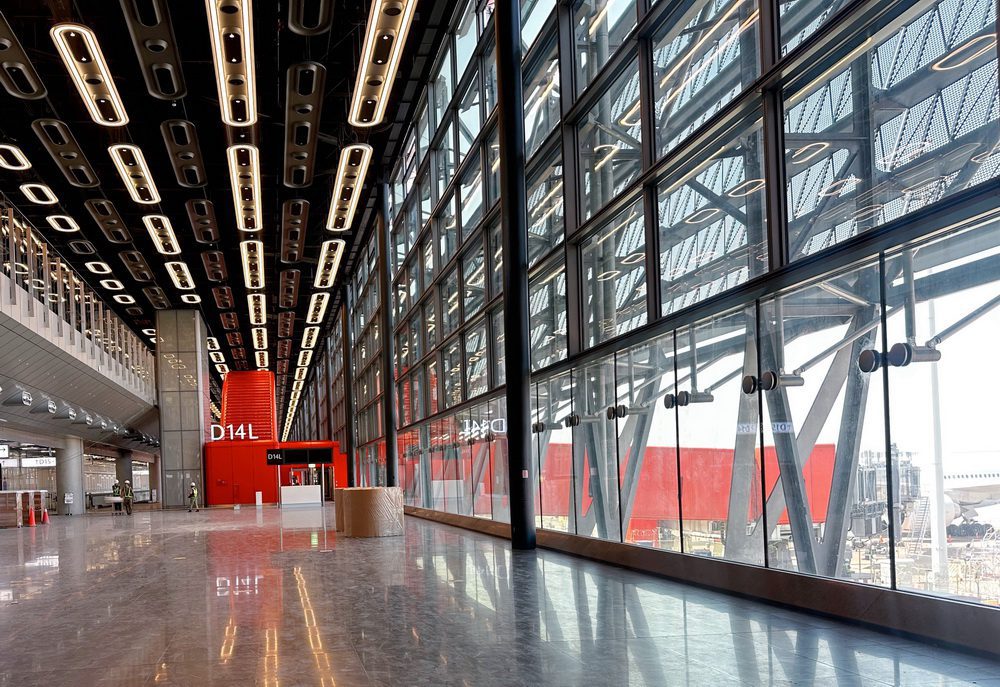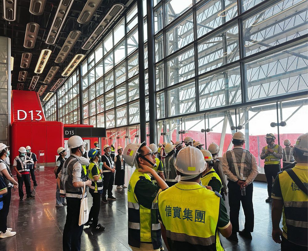 熟悉動線過程中,各單位體驗到開放式候機區的寬敞舒適。大面積玻璃帷幕將遮陽板及骨架設置於室外,遮陽板有效調節光線、保持室內溫度舒適,也不阻擋視線,讓旅客可近距離欣賞飛機起降;雙向電走道減少旅客步行時間,沿途還可欣賞牆面的公共藝術作品。