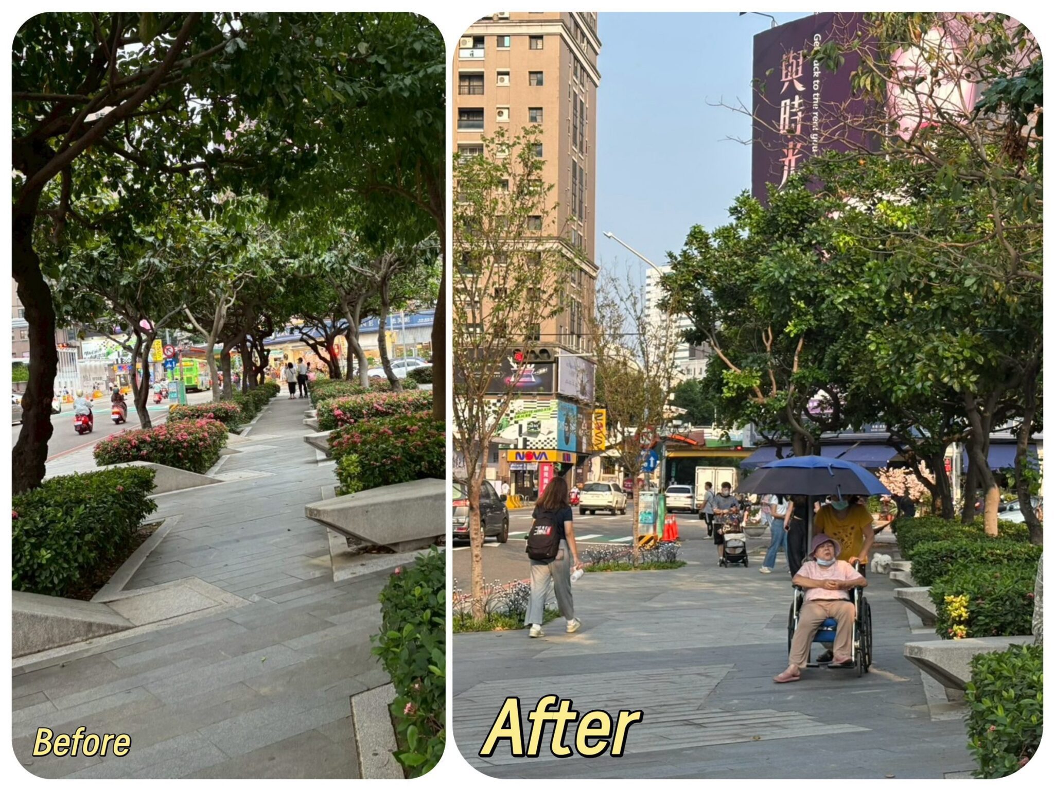 經常在草悟道及市民廣場運動的民眾也主動向市府反映回饋,他們表示改善後的路口視野更開闊,步道運動更加順暢,原本過於密集的樹木經調整後通透性大幅提升,夜間可見度明顯改善,運動更安全,民眾不必擔心樹穴、家具阻道或與他人擦撞,整體空間也變得明亮舒適;輪椅使用者與帶小孩的家長則指出,通道順平後推行更省力,原本需繞行的區段如今可直行通過,感受到市府「細節中見貼心」的用心改善。