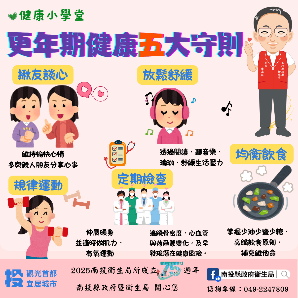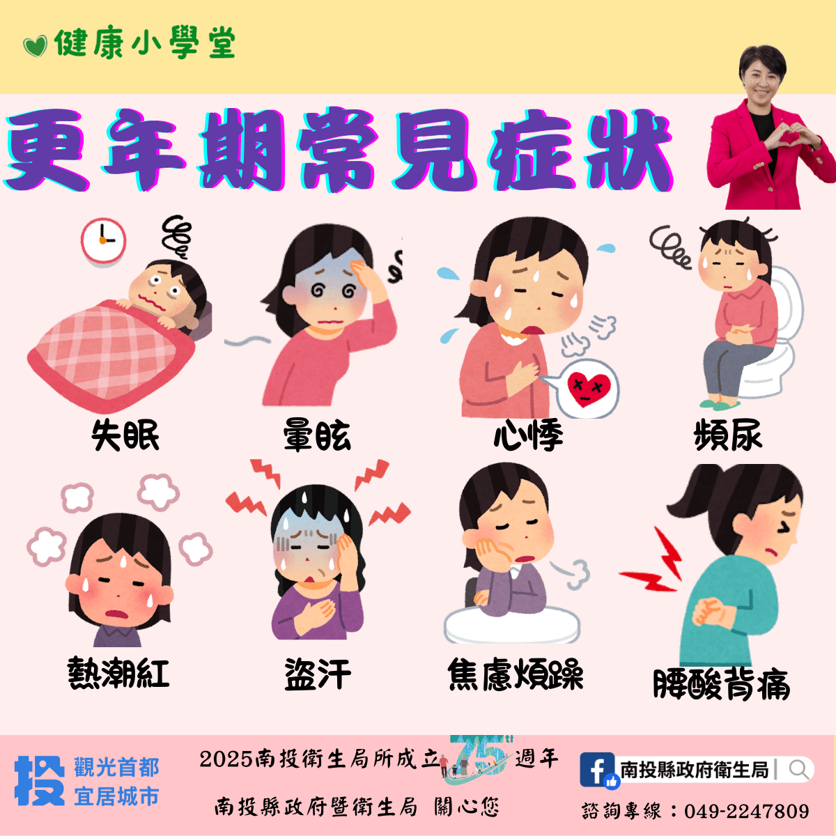 衛生局長陳南松指出,更年期為自然的人生階段,並非疾病。若能透過日常生活方式醫學的實踐與自我健康管理,不僅可減少慢性病風險,亦能在身心調適中培養自信與幸福感。在「2025世界更年期關懷日」之際,衛生局也呼籲民眾關注更年期健康,從日常生活中實踐生活醫學,將健康行為內化為生活習慣,並透過理解與陪伴,共同營造健康宜居、熟齡友善的南投。