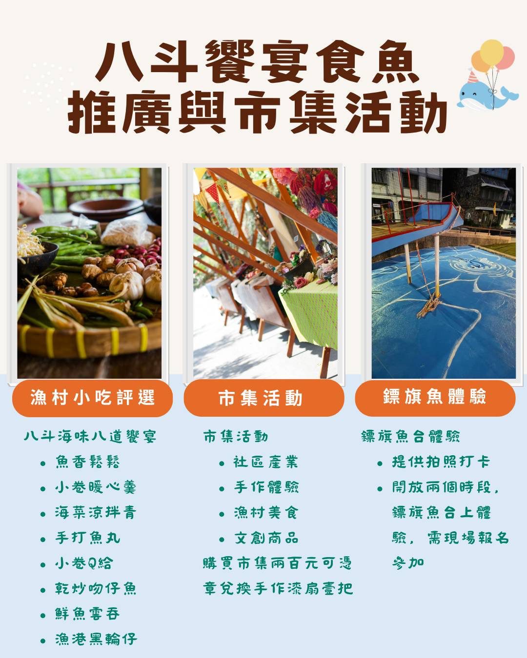 產業發展處長蔡馥嚀表示,本次活動最大亮點是由社區團隊以在地材料與手工打造的「鏢旗魚台」,象徵八斗子漁民代代相傳的勇氣與智慧。現場設有解說導覽與拍照打卡點,讓民眾能親身體驗鏢旗魚文化的精神。此外,漁村媽媽也以當季漁產烹調出鯖魚香鬆、小卷羹、魚丸黑輪、海菜沙拉等多道海味料理,讓市民在活動中品味漁港的鮮味與人情。