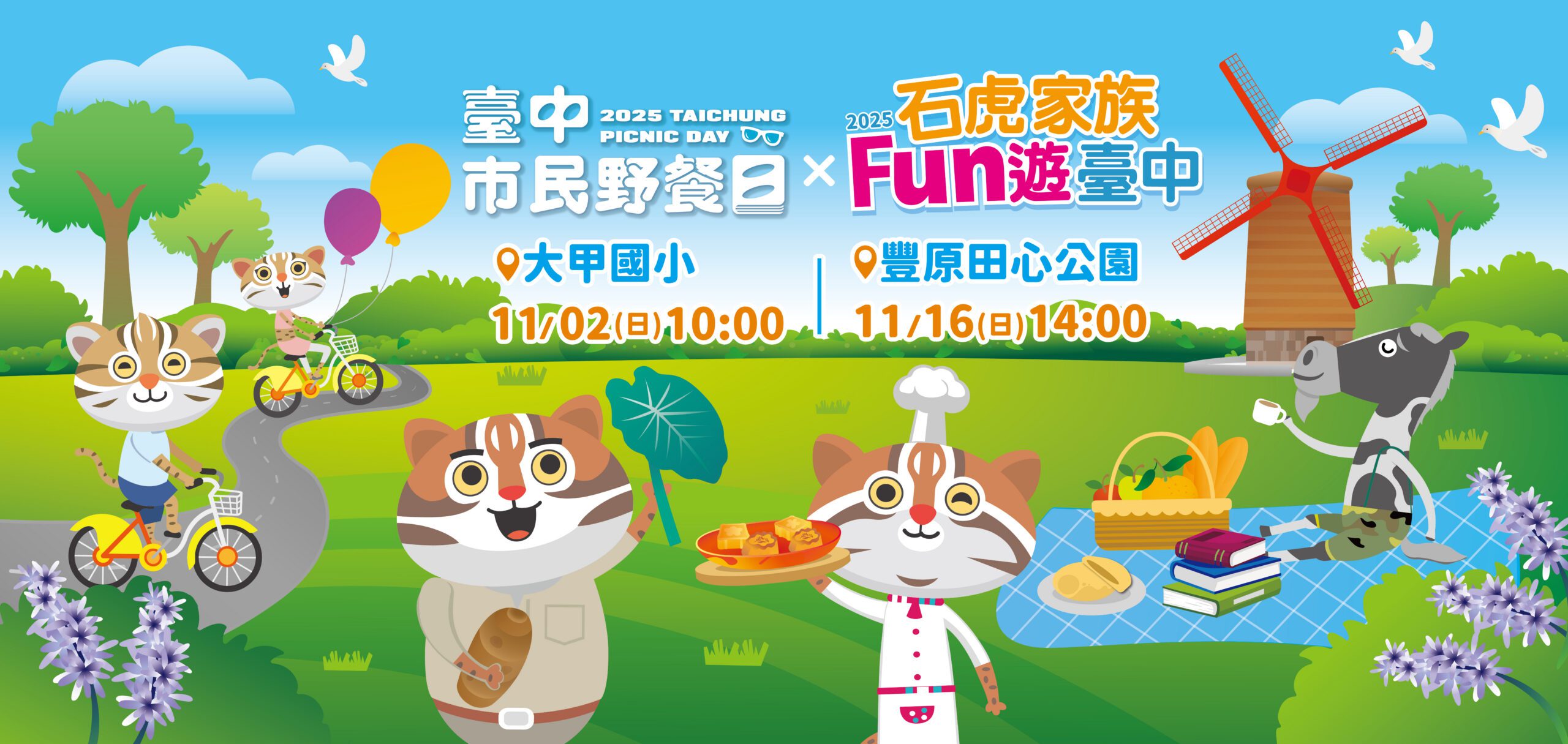 2025台中市民野餐日11月2日大甲場將於大甲國小舉辦,「石虎家族與歐米馬」5隻吉祥物將全員出動,萌翻大甲!台中市政府新聞局長欒治誼表示,當天除了可愛吉祥物與市民朋友面對面,還有YOYO家族人氣明星KIWI姐姐、鳳梨哥哥及葡萄姐姐帶小朋友盡情唱跳放電,現場還有互動遊戲攤位、DIY手作攤位、文創和農特產品市集。民眾只要上傳照片至「石虎家族Love&Life」臉書粉絲專頁就有機會參加抽獎。當天準備豐富活動和精彩表演,歡迎大家來大甲一同度過快樂野餐日。