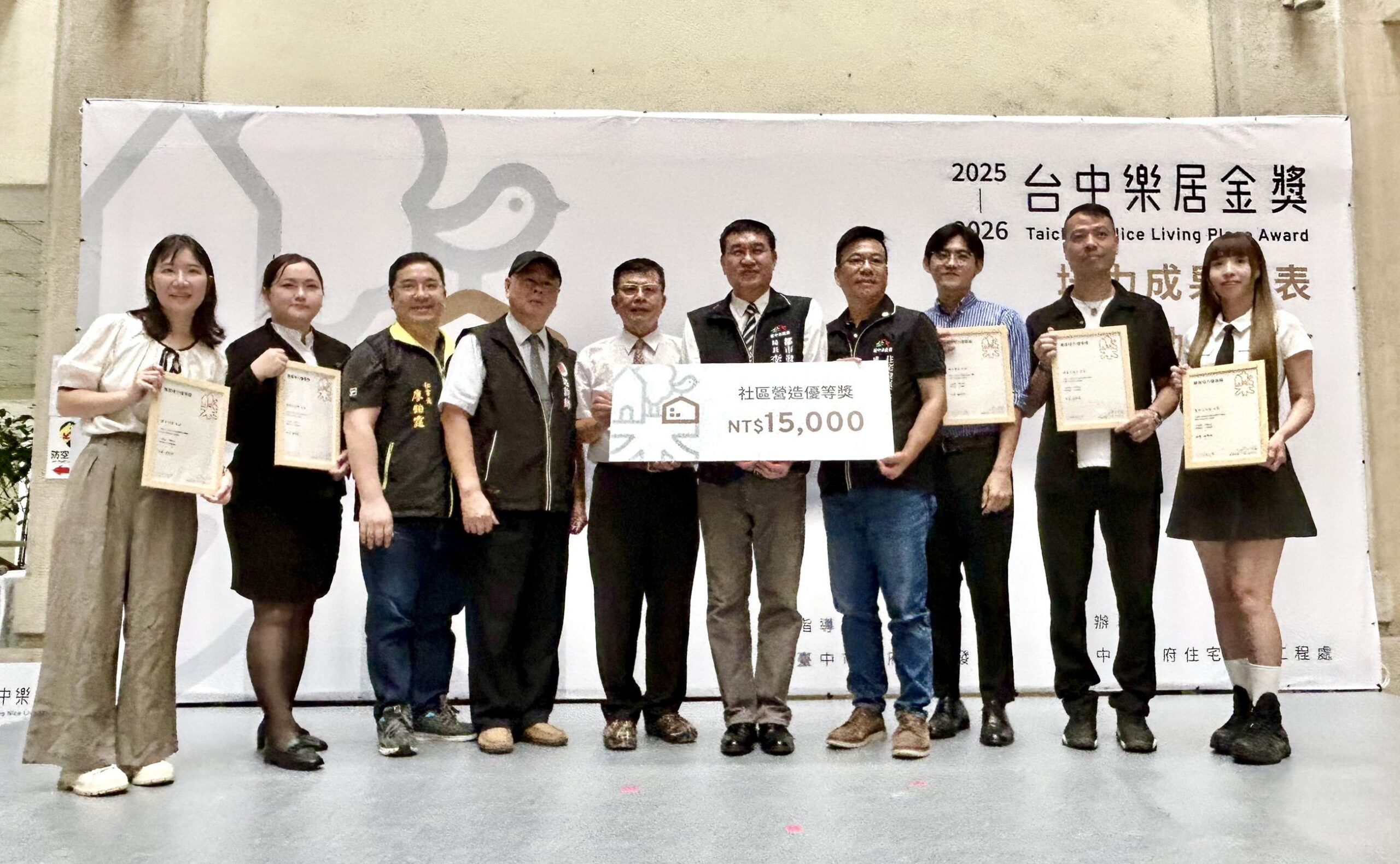 台中市政府主辦的「台中樂居金獎」持續推動社區宜居理念,今年培力課程首度採評比方式進行,透過課程學習與繳交作業,成功挖掘社區亮點。經最終分數統計,共計10組社區獲獎,並獲得獎狀及獎金新台幣15,000元,肯定其積極投入社區管理維護工作的成果。今(20)日由都發局長李正偉代表市府頒獎及正式啟動「2026台中樂居金獎雙年獎」,並同步宣布此屆賽制活動評選計畫方式。