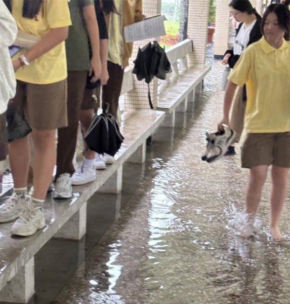 羅東高中校園因排水系統不良,風雨走廊積水最深達30公分,學生驚見走廊積水,無奈脫下鞋子捲地褲管、打赤腳涉水通過。