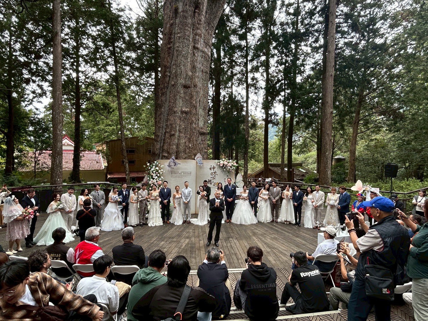 阿里山神木下婚禮,10月19日的婚禮體驗,融合茶文化,加入蘊含祝福意味的「團茶」手作活動,中午享用鄒族部落特色午餐、體驗鄒族婚禮儀式、「優游吧斯鄒族文化部落」,傍晚時分,入住阿里山賓館,享用特色晚餐前,新人還可以至7樓景觀平台獨享專屬的雲瀑流雲、燦爛夕陽;10月20日在阿里山香林神木平台,展開互許終身的證婚儀式,再順遊至阿里山森林遊樂區絕美地景拍攝婚紗,享受入住阿里山星級雲端之境的專屬喜宴服務、森林音樂派對,以及結合咖啡、茶園、風味餐廳等一連串專屬阿里山特色的婚旅遊程。