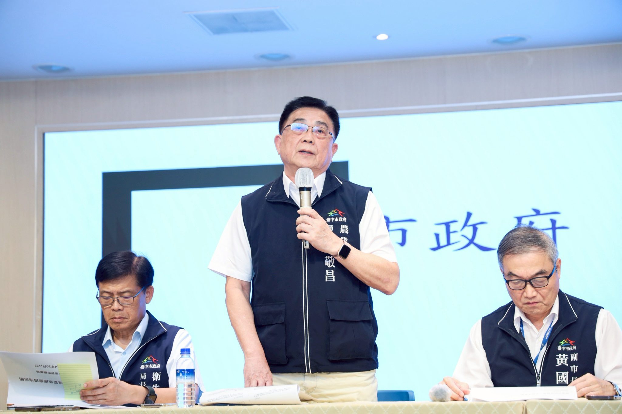 台中養豬場疑似發生非洲豬瘟案例,台中市政府第一時間啟動防疫機制,今(22)日下午火速召開記者會。副市長黃國榮表示,中央已成立應變小組,並於台中設置前進指揮所,市府除立即啟動防疫應變作業,市長盧秀燕今早也召開「台中市非洲豬瘟緊急應變小組會議」,邀集相關單位共同研商後續防疫作為。黃副市長強調,政府已全面啟動防疫應變機制,將以最嚴謹態度守護民眾健康。