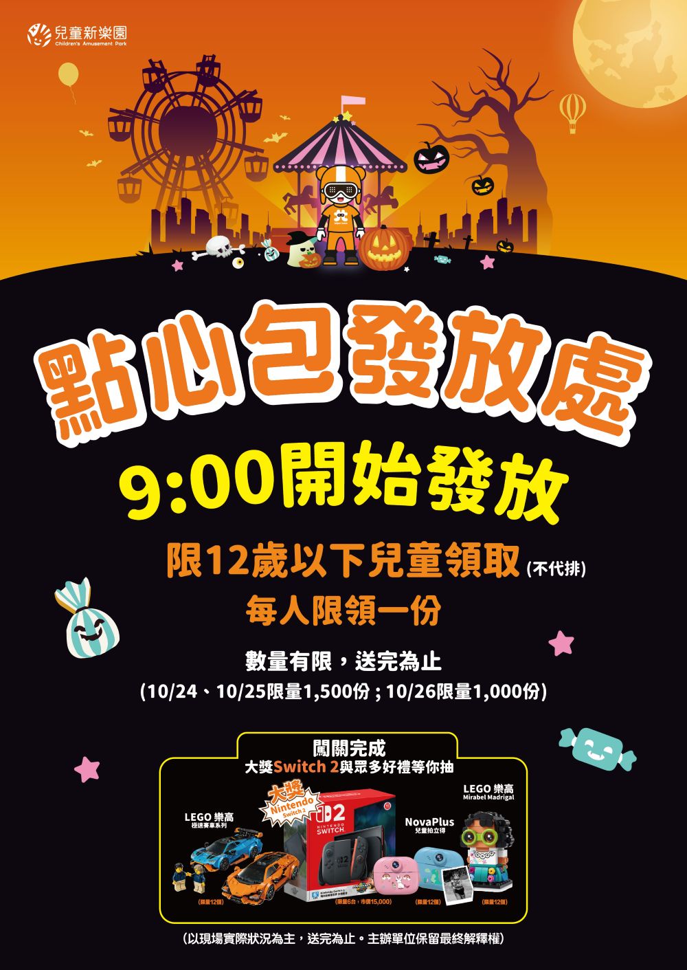 活動期間,每日上午9時於園區大門廣場,限量發送「點心包」與「闖關卡」,限12歲以下孩童領取,每人限一份,送完為止。