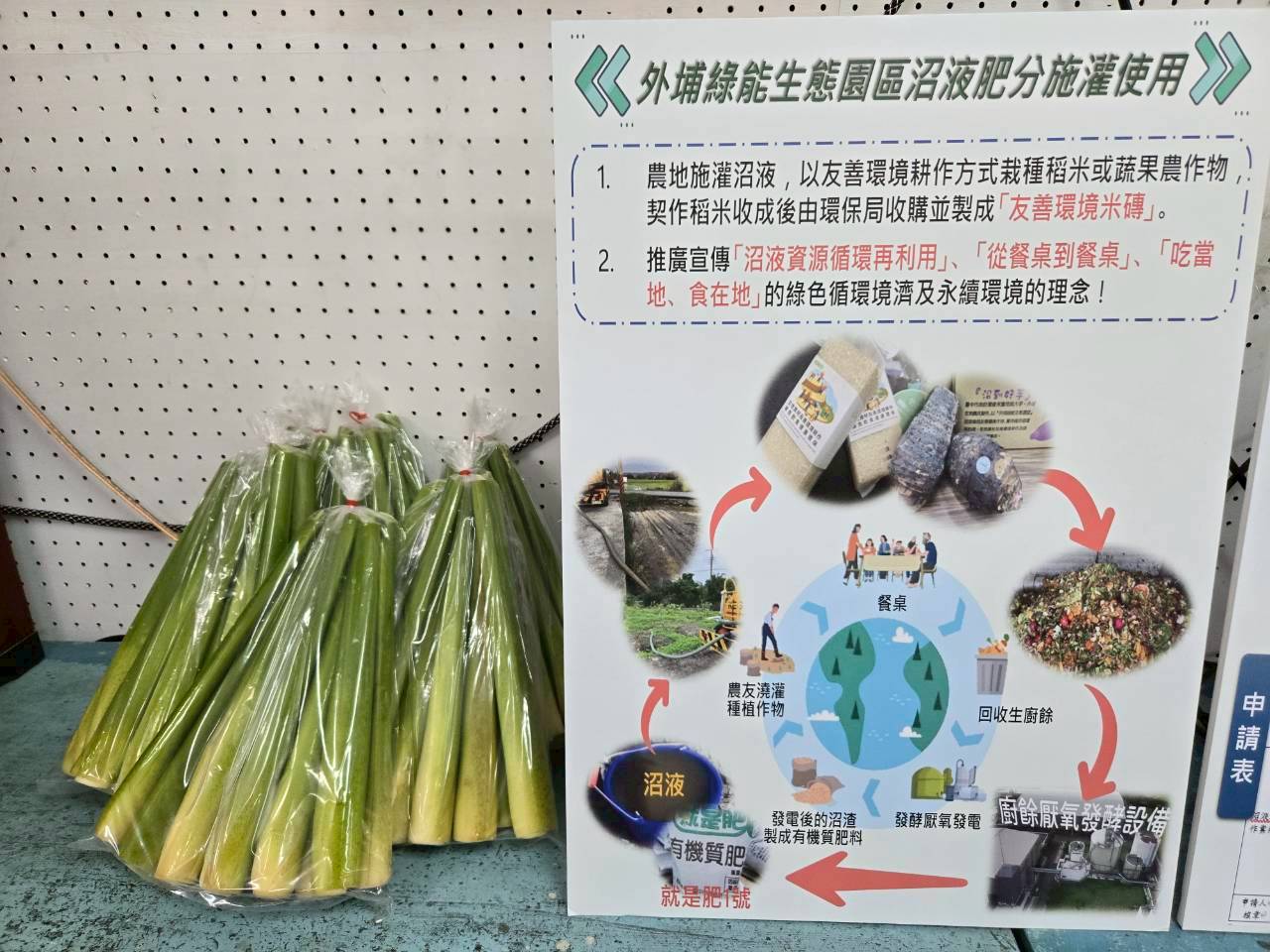 為使參與者體驗沼液施灌成果,現場展示並分享以沼液栽種的筊白筍農作物,透過農友的親身經驗,更能感受沼液在農田利用上的具體成效,活動結束後並將農作物宣導品捐贈予「財團法人台中市私立宜家社會福利慈善基金會」分享公益團體,以實踐「食在地、用在地」的食農教育精神。