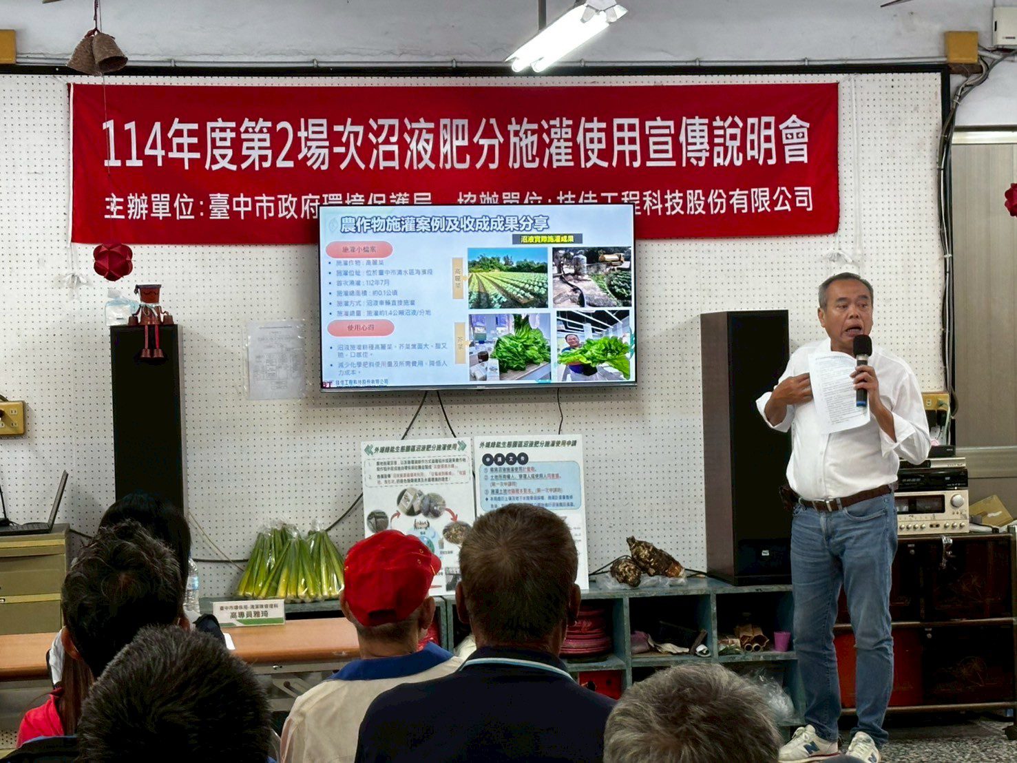 為推動廚餘資源循環利用,落實永續農業與友善環境理念,台中市政府環境保護局昨(23)日在台中市大甲區德化社區發展協會活動中心舉辦「114年度第2場次外埔綠能生態園區沼液肥分施灌使用宣傳說明會」,活動邀請外埔、大甲、大安區之農友及大甲蔬菜產銷班第17班共同參加,透過專家講授、實地體驗、農作物收成分享,吸引約40位農民踴躍參加,展現在地農民對環保與與永續耕作的高度熱情。