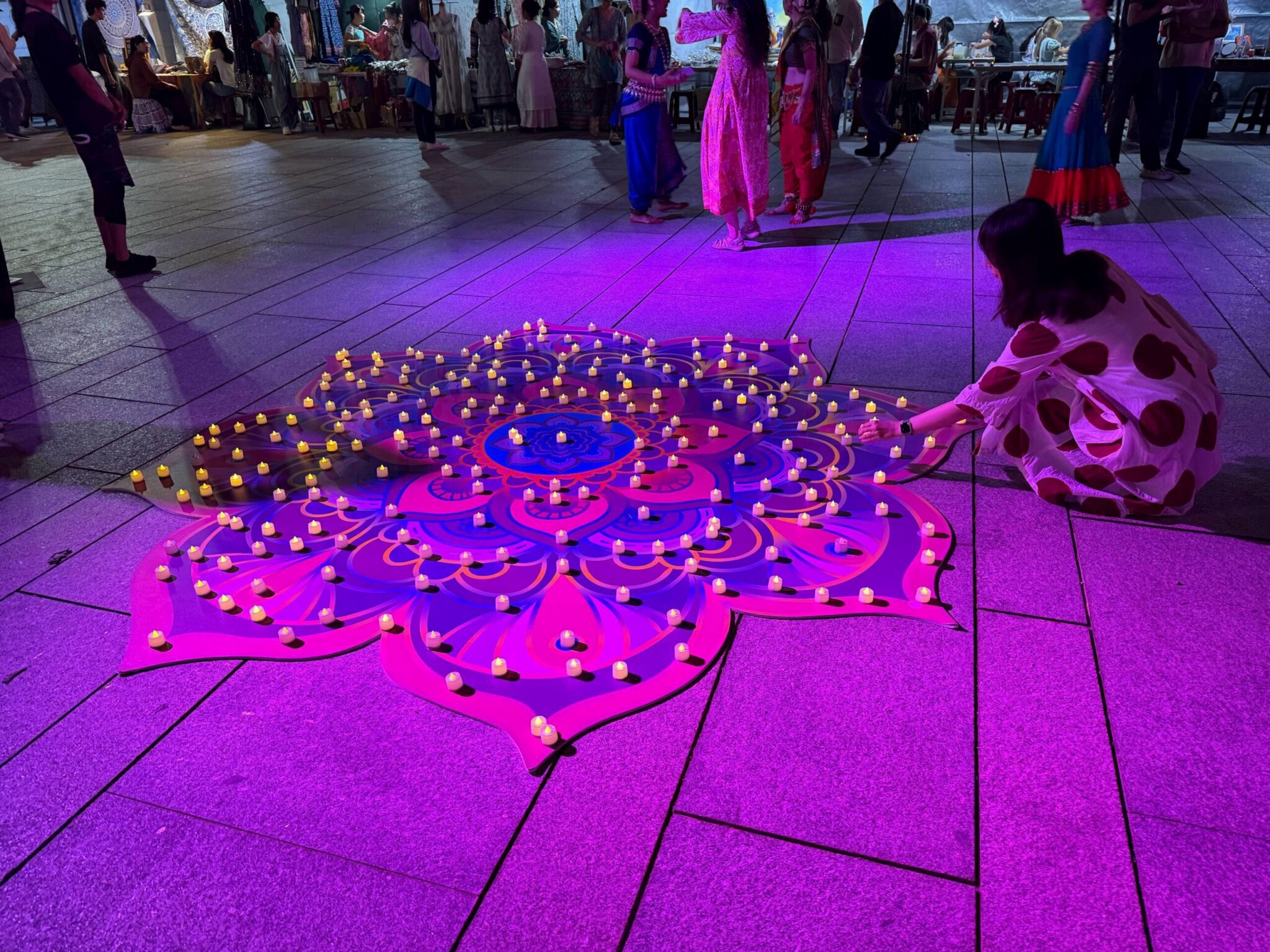 民政局說明,今日開幕式由西瓦印度舞團、Nuvibe舞團及台中泰雅原舞工坊共18名舞者攜手帶來全新編排的融合舞蹈,展現印度舞蹈與台灣原住民族樂舞間的跨文化對話;市集入口則設有大型「藍果麗」互動藝術裝置、光拱門與文化背景牆,供民眾打卡拍照,象徵迎接財富女神拉克希米降臨,傳遞光明、希望與祝福。此外,現場亦設有古老彩繪藝術「Henna」體驗區,吸引眾人駐足參與,感受印度文化的多元魅力與節慶喜悅。