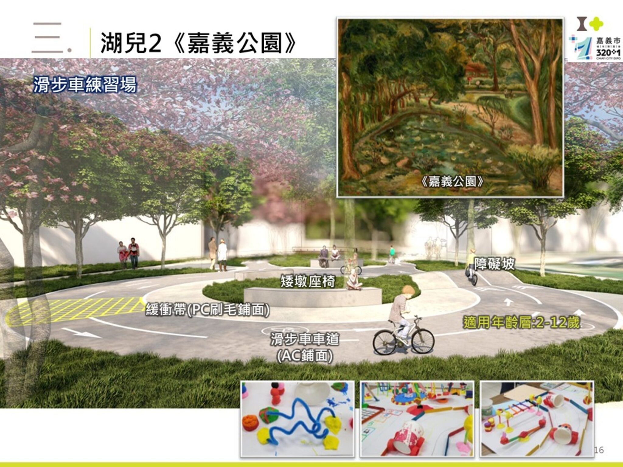 市府建設處表示,本工程有13個基地,面積合計1.9公頃,總經費8,561萬元,其中工程經費7,590萬元,工期365天,由惇陽工程顧問有限公司設計監造、陸奕營造有限公司施工。公園將設置5處主題共融式遊戲場及8處簡易綠化公園,不僅在開闢前廣納民眾意見,「所有願望一次滿足」,建置適合青銀族群使用的遊具、串聯公園間步道,也依據小朋友們的期待,建置滑梯、秋千、滑步車練習場等遊具與場域,更融合在地文化意象及陳澄波老師畫筆下的嘉義風光發想,打造兼具藝術、美學與休憩功能的都市綠地。