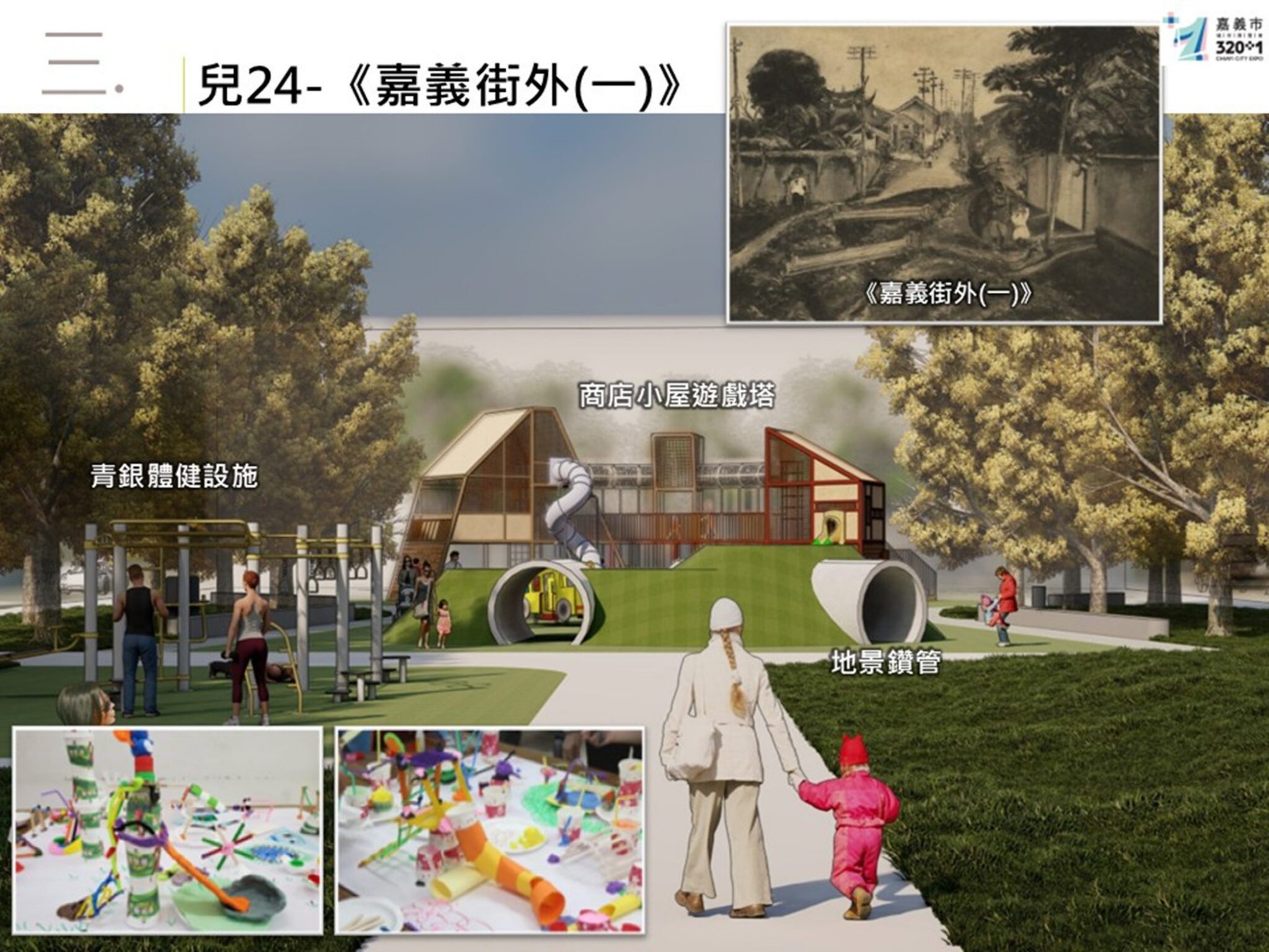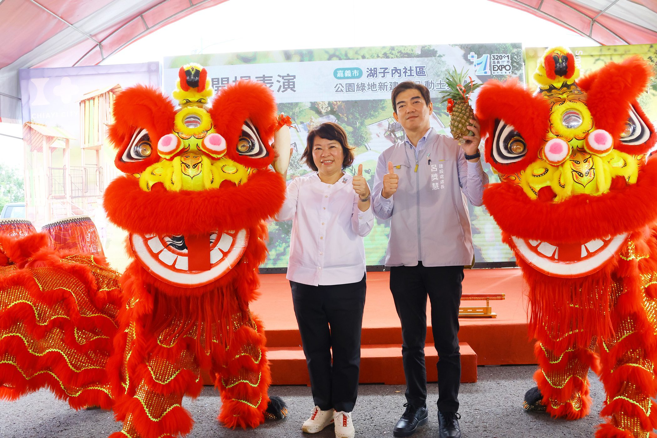 這塊形似「金雞母」的湖子內地區生活品質持續在提升,今日在兒24基地所舉辦「嘉義市湖子內社區公園綠地新建工程」預計於明年底完工,將新增5處遊戲場、8處綠化公園,不僅適合全齡民眾遊憩,在極端氣候下,公園綠地也為城市培植了更強健、具韌性的體質,讓嘉義市朝向更加「宜居、共融、永續」目標邁進。