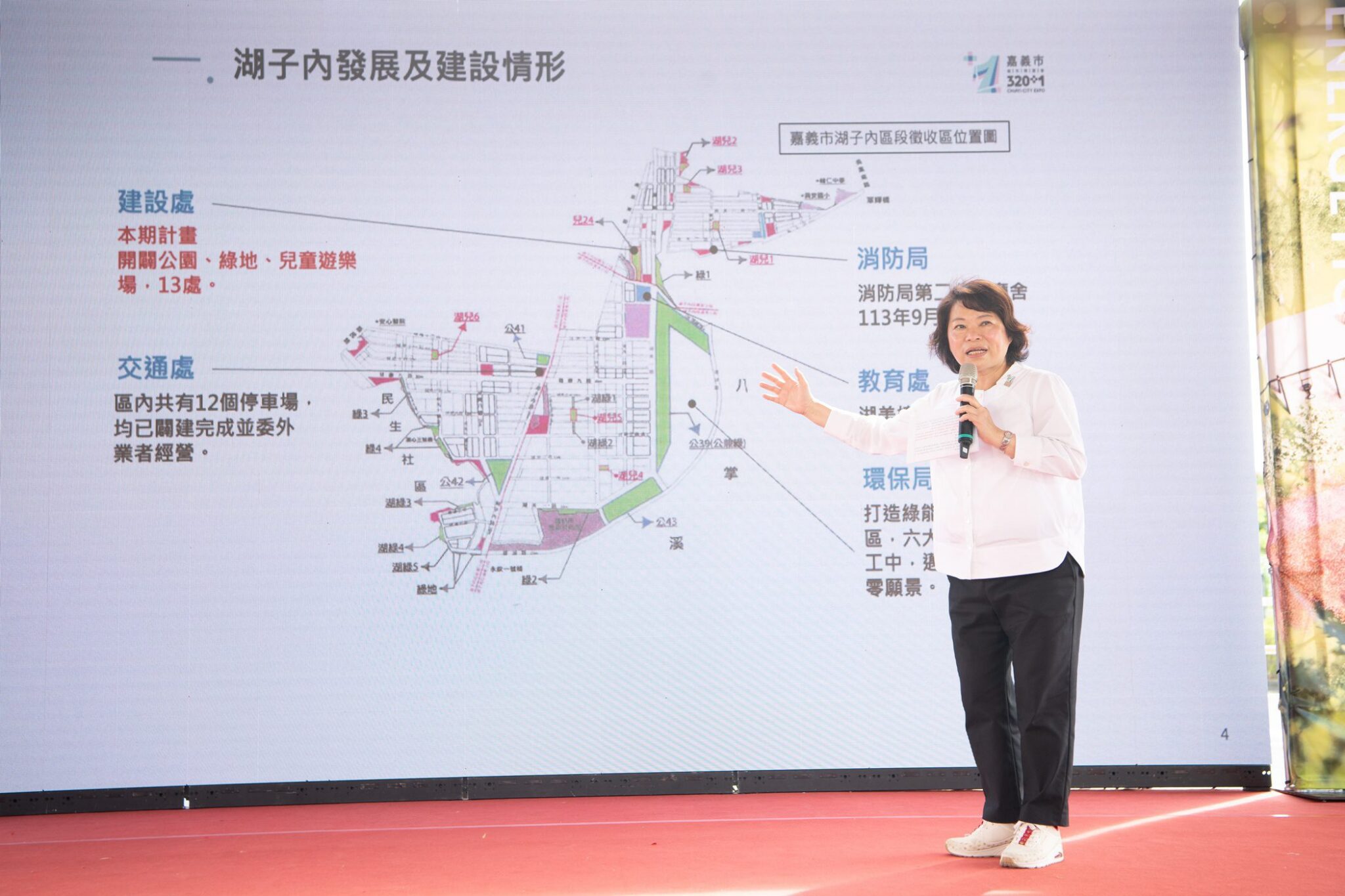黃敏惠表示,嘉義市湖子內區段徵收至今逾20年,感謝過程中市民的信任與支持,攜手努力讓區段徵收完成後的湖子內地區愈加繁榮。市府團隊持續推動工程建設,提升生活環境,近年已陸續完成里民活動中心、消防局的第二分隊廳舍、交通處停車場12處、環保局的永續循環園區及湖子內一期工程4處公園11.8公頃,串連長達1.8公里綠廊道等,逐步形塑完善的生活圈。