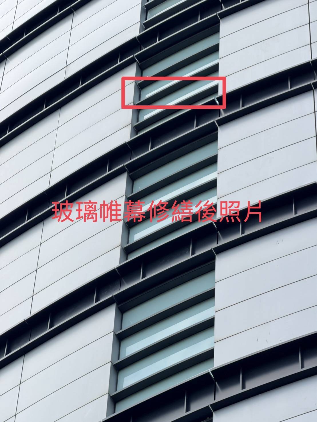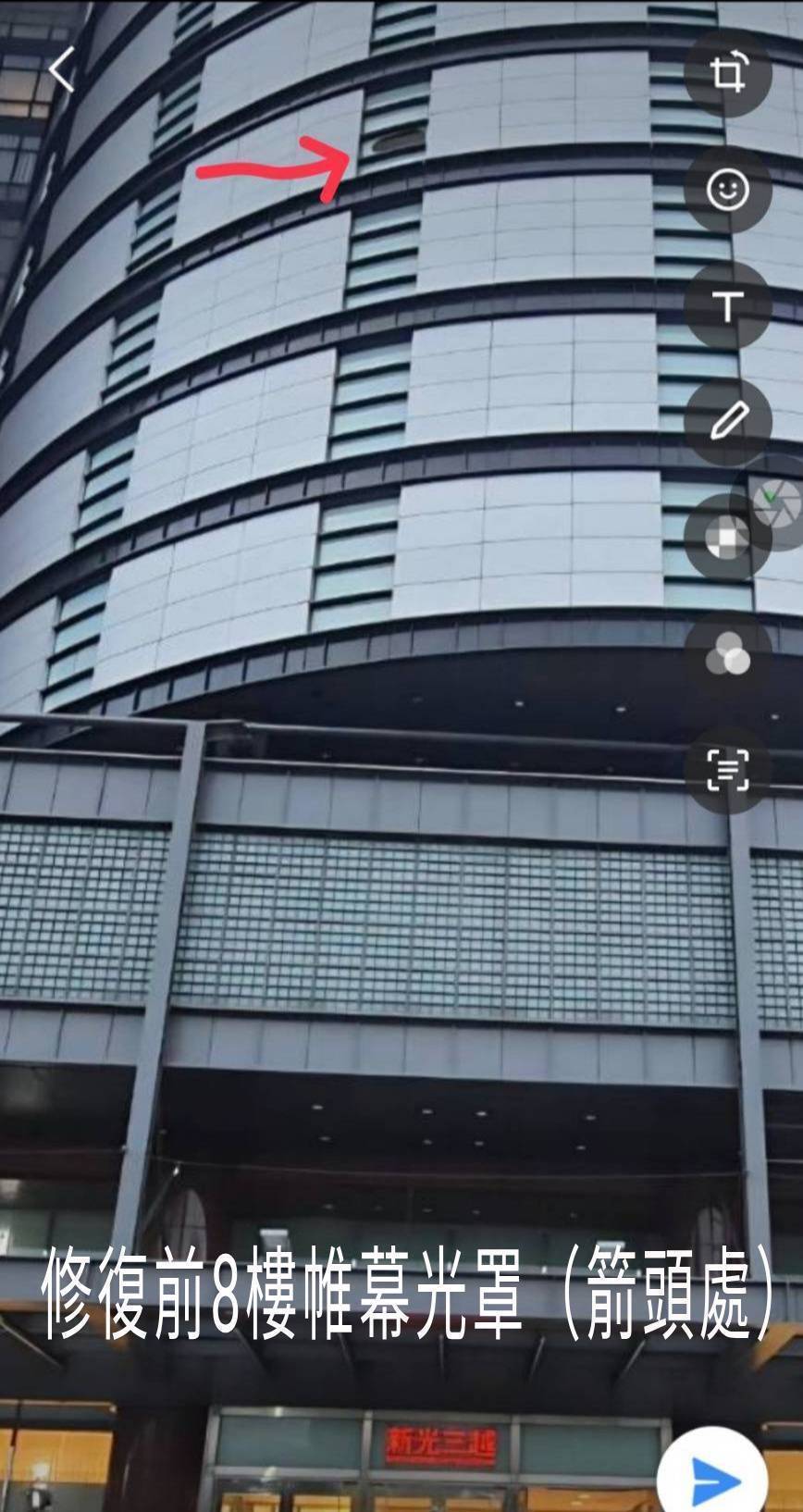 台中市新光三越百貨因近日風強在北側8樓燈箱光罩,遭異物擊破破損,台中市政府都市發展局立即派員至現場查察,進行區域管制, 經限期改善,業者已於今日上午完成燈箱修復工作。