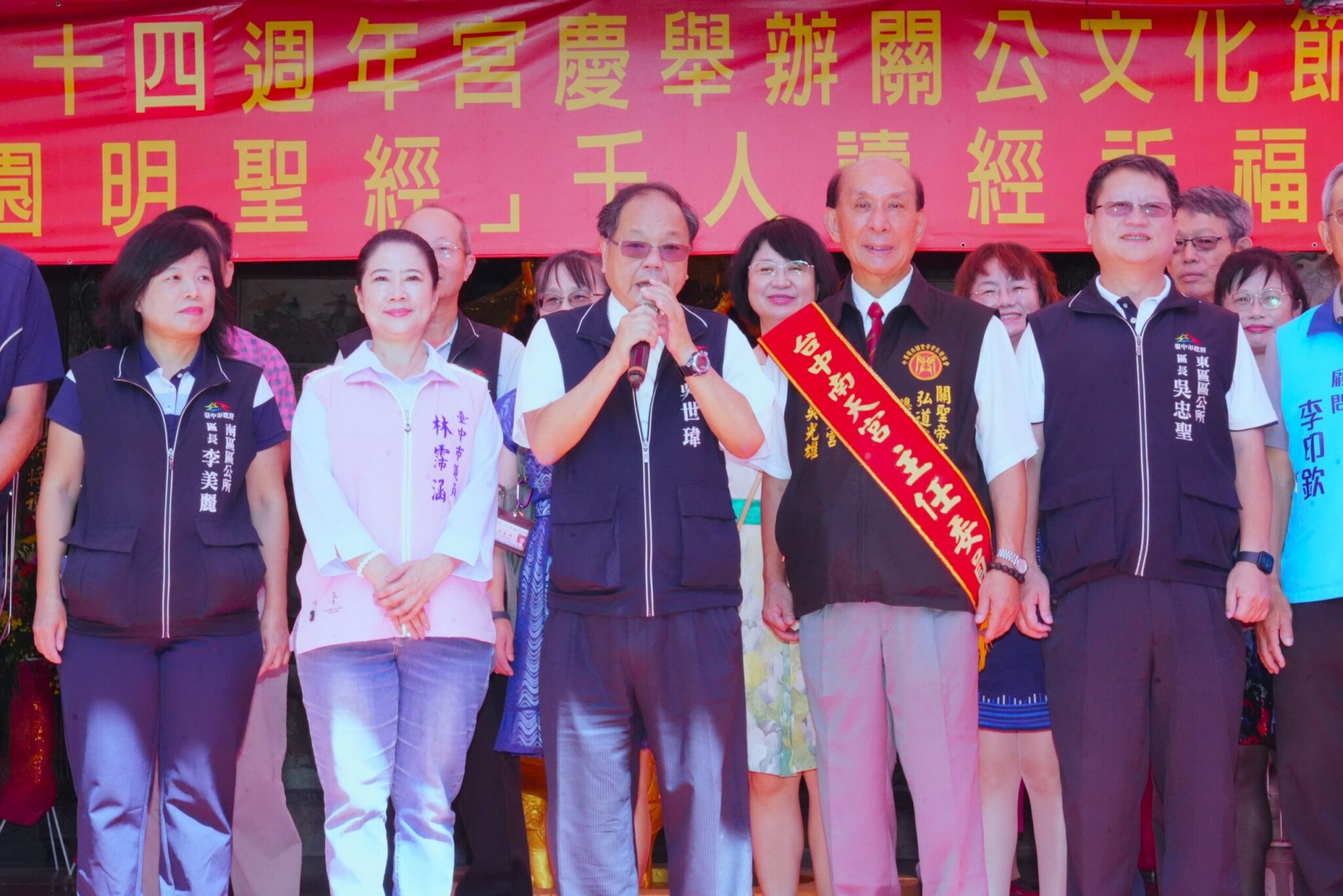 台中南天宮主委吳光雄指出,在盧市長的帶領之下,感謝市府團隊對市政建設、民生福祉與教育發展的貢獻,展現台中城市的團結與溫暖。他並提到,《桃園明聖經》倡導的宗教廉潔與倫理道德主要體現在忠義、仁愛、孝道、禮讓和勤奮等傳統美德上,提醒民眾以五倫五常為做人準則,守禮義廉恥之道,發揚關帝文化中忠義仁勇的精神,讓家庭與社會都能和諧共榮,並祈願在關帝爺庇佑下,大家都能福慧增長、家庭平安、事業順利、財源廣進。