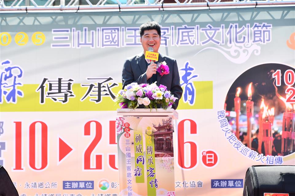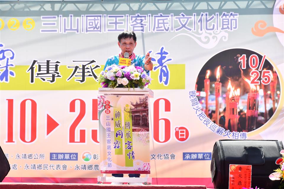 彰化縣三山國王客底文化節於10月25、26日在永靖鄉同霖宮熱鬧登場。昨(25)日晚間舉行火把迎神繞境祈福儀式,今(26)日上午舉行開幕式、下午朝聖典禮、晚間宮廟交接儀式。開幕式由縣長王惠美、三山國王客家文化協會會長胡祥畯、同霖宮主委黃一清等人參與。王縣長表示,彰化縣三山國王客家文化協會自91年起開始整合縣內39間宮廟擲筊輪流舉辦文化節活動。今年由同霖宮主辦,將縣內39間廟宇共117尊神尊齊聚一堂,為眾人祈福,讓信眾一次獲得所有神明的庇佑。感謝胡會長,每年的活動都辦得比往年更加盛大,期盼透過活動彰顯客家族群的寄託,也讓大家更認識永靖客庄。