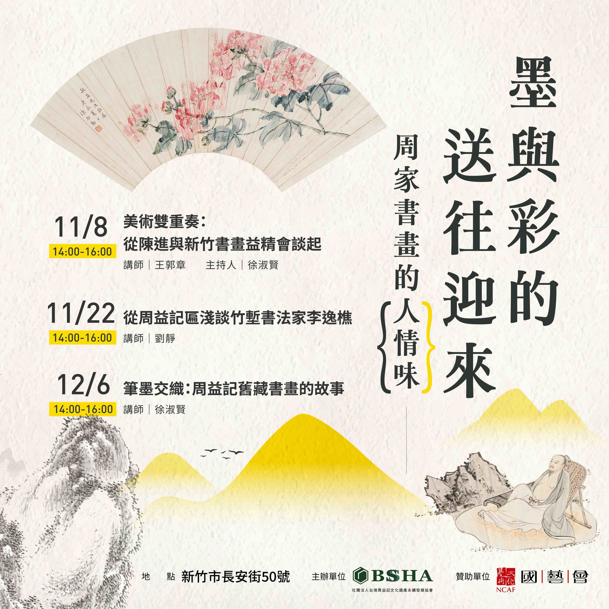 文化局說明,此次系列講座獲得國藝會贊助,將於11月至12月間舉行三場活動,內容橫跨藝術史、社交網絡與家族文物研究。首先由地方文史工作者王郭章老師帶領觀眾,從畫家陳進與「新竹書畫益精會」出發,探討日治時期新美術與傳統書畫的交會與轉型;接著由輔仁大學老師劉靜從「周益記」匾額談起,梳理新竹書法家李逸樵的生平與人脈網絡;最後由台東大學老師徐淑賢介紹「周益記」舊藏書畫的故事,帶領觀眾窺見日治時期跨海文化交流下的家族生活樣貌。三場講座內容豐富多元,從藝術視角回望地方文化的延續與創新。