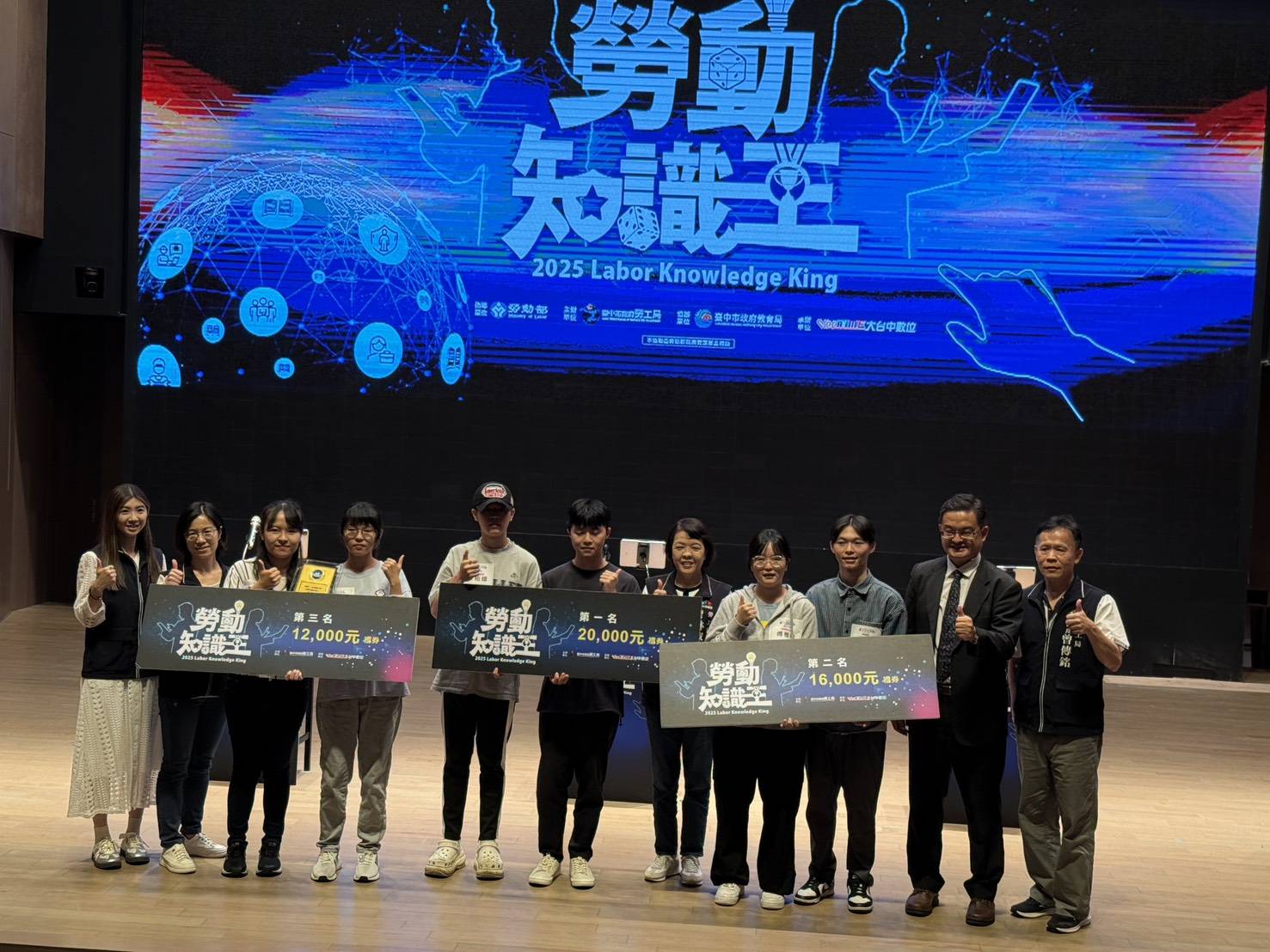 為啟發青年學子對勞動權益的認識,讓勞動法令知識向下扎根,台中市政府勞工局祭出超過15萬元獎勵辦理「勞動知識王」,在昨(25)、今(26)兩日激烈競爭下,最終由國中組「北勢國中」、高中職組「霧峰農工及台中一中」、大專院校組「亞洲大學」奪得冠軍,各組冠軍、亞軍及季軍各獲得2萬元、1萬6千元及1萬2千元禮券;此外,今年度「勞動之星」從91隊隊伍中脫穎而出,由大專組冠軍亞洲大學拿下!