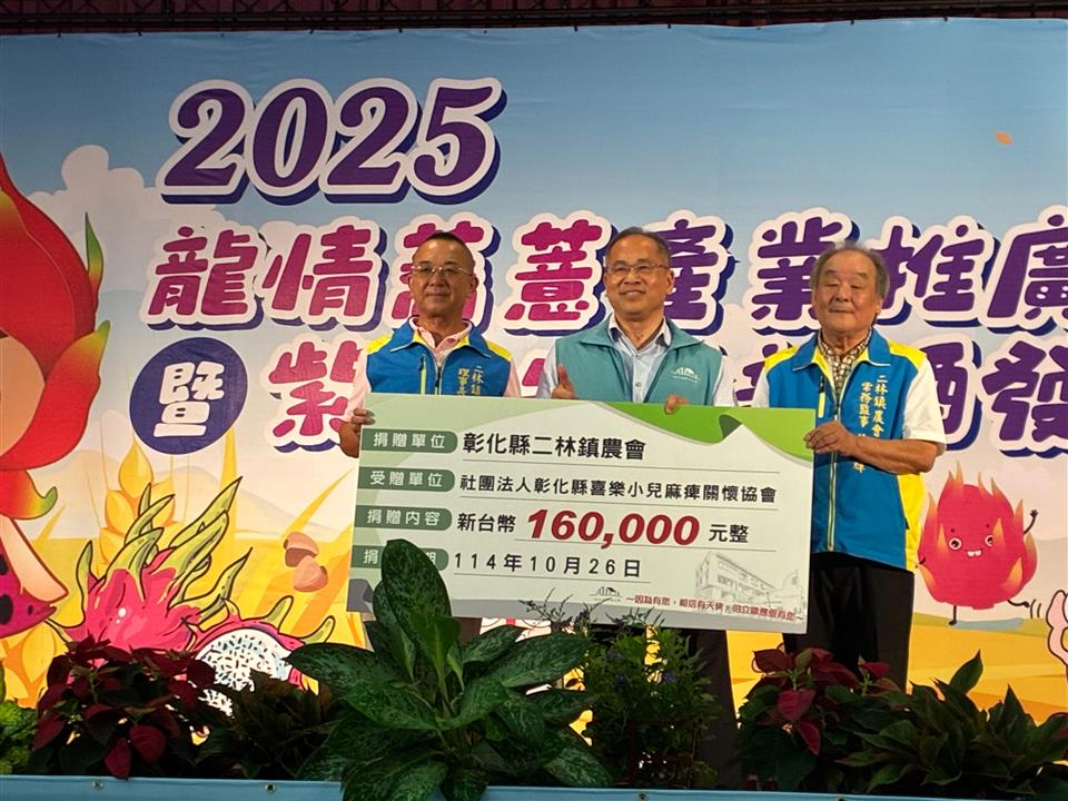 二林鎮農會於今(26)日上午在二林教育文化園區辦理龍情蕎薏產業推廣活動,縣長王惠美與會,二林鎮農會理事長陳界灯、常務監事陳光輝、總幹事邱士平等人出席。今天活動除頒發114年度優質紅龍果評鑑外,也捐出16萬元做為喜樂小兒麻痺關懷協會興建「伯立歐家園Polio Home」的基金。民眾只要購買二林鎮農會的農特產品,二林鎮農會就提撥5元作為捐款,藉此拋磚引玉,吸引更多團體及企業主一起共襄盛舉。