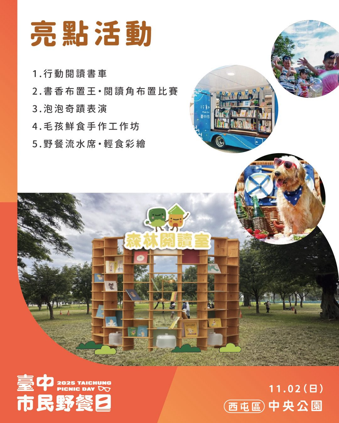 建設局補充,現場並設有舊書交換攤位,持續推動閱讀融入生活,讓書香隨行不間斷。中央公園不僅是市民野餐首選場域,更是「台中美樂地」計畫的重要據點,公園3.0升級設計融合遮陽與降溫功能,提供全年無休、友善舒適的遊憩環境。