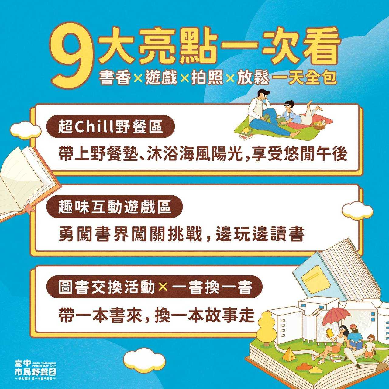 教育局說明,活動當天有多項精彩抽獎活動,邀請大家帶著一本喜愛的書,與家人、朋友相約走進頂魚寮公園,一起閱讀、野餐、聽音樂,在陽光海風中體驗專屬於海線的悠閒午後時光!更多資訊歡迎追蹤台中市家庭教育中心Facebook粉絲專頁,或加入LINE官方帳號(ID:@tcfamily)了解。
