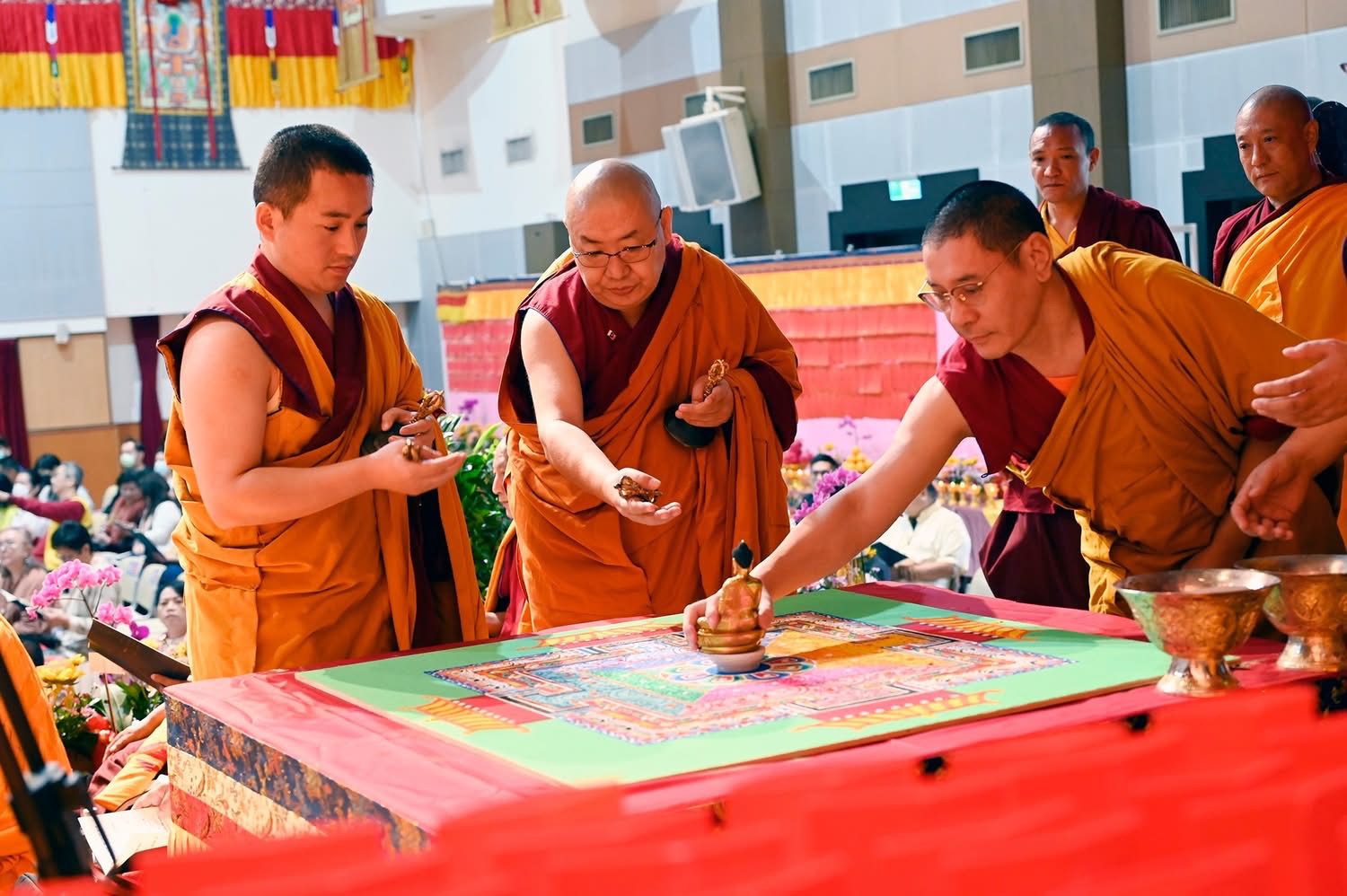 圓滿日,第42任薩迦法王線上開示,勸勉眾人以發菩提心為行持根本,將三日所修一切善根總回向於世界止息干戈、台灣國泰民安、法界眾生究竟成佛。總回向與唱誦聲中,志工恭發「藥師佛」壇城彩色聖沙與大眾結緣,象徵法會總加持攝受於日常,化為自利利他的恆長資糧。