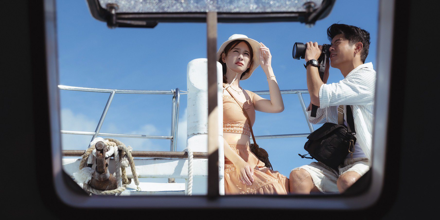 圖:王柏傑(右)、安心亞為了《我們的藍調時光》第一次前往吉貝島拍攝。照片/米神國際提供