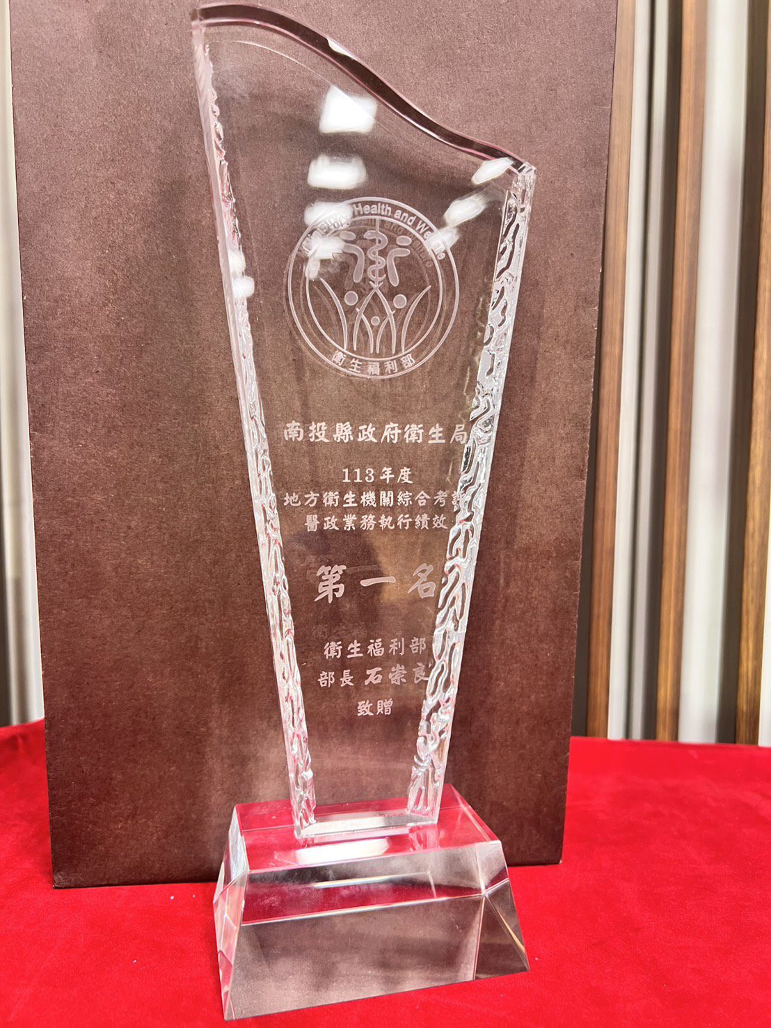 南投縣衛生局榮獲衛生福利部頒發「113年地方衛生機關業務~醫政類業務第四組第一名」,衛福部為表彰各縣市衛生局對於執行醫政業務的努力,於23日舉行頒獎典禮,由醫事司長劉越萍親自頒發獎座,衛生局醫政科長張淑眞代表接受公開表揚。
