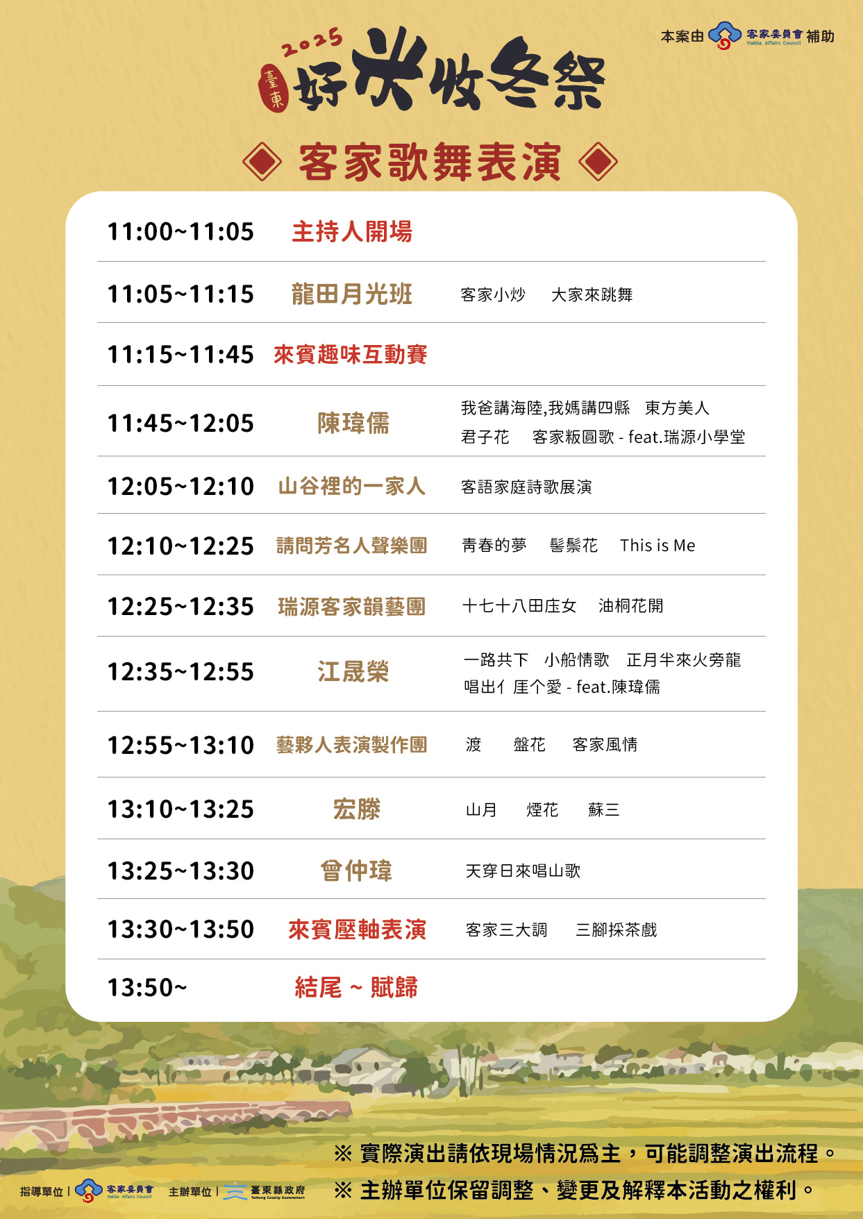 縣府民政處表示,「客家生活節」也將邀請在地社團與歌手互動演出,更特別安排臺東詩歌節朗誦第二名的客語家庭得主,以自然生動的方式呈現「屋下講客話」的日常情景,讓觀眾聽見生活中最動人的客語旋律。現場還將設多項手作體驗與文創市集,包括藍晒、稻草手作按摩棒、搓粄圓(食粄圓)DIY、打甜粄活動等,讓民眾動手做、親身玩,在歡笑中感受客家文化的生活魅力。