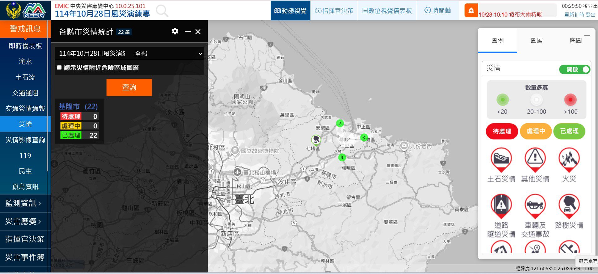 為強化地方政府在災害發生時的資訊整合與即時應變能力,基隆市消防局在10月28日上午舉辦「應變管理資訊雲端服務(EMIC 2.0)系統操作演練」。本次演練動員民政、交通、工務、警察、環保等局處及各區公所,共約40位防救災人員參與,模擬颱風與豪雨造成多點災情,地方開設災害應變中心的整體應變流程。