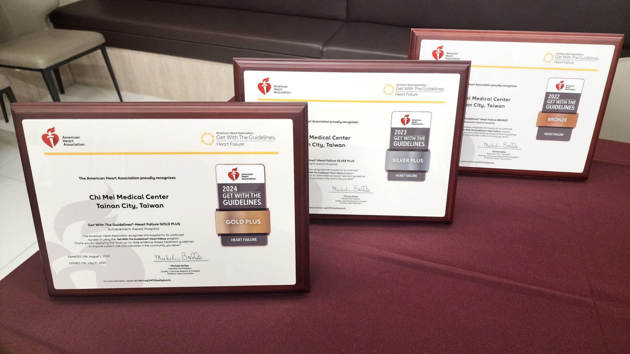此外,奇美醫院一直持續推動心血管品質管理、臨床研究與健康教育,積極參與AHA國際計畫,並以豐富的臨床數據與照護經驗,展現臺灣醫療團隊的專業與實力,繼先前的銅獎、特優銀獎之後,2024年再獲頒AHA心臟衰竭照護品質「特優金獎」(Gold Plus Award),充分展現其長期精進的卓越成就與專業實力。