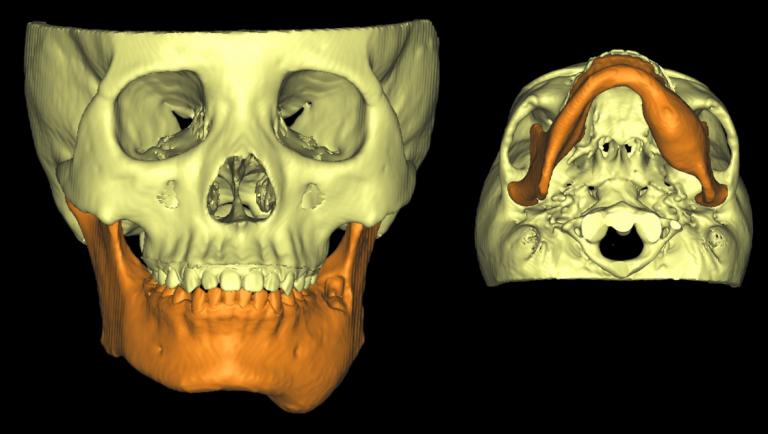 ▲3D電腦斷層顯示患者左下顎腫脹,導致顎骨變形、臉部不對稱及咀嚼障礙。(圖╱彰化秀傳提供)