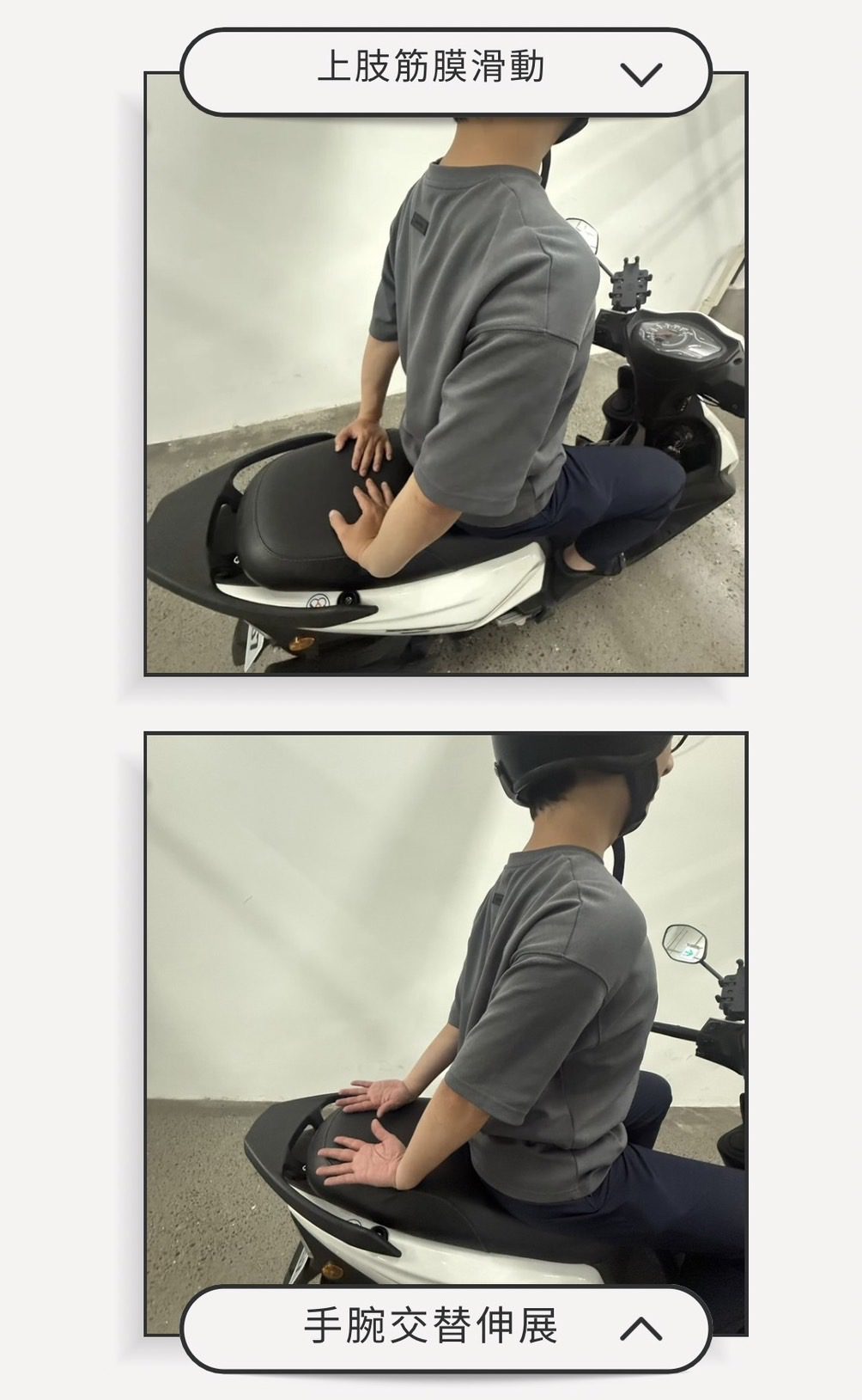 一手扣住後座把手,挺胸,讓上背恢復靈活度與呼吸空間。