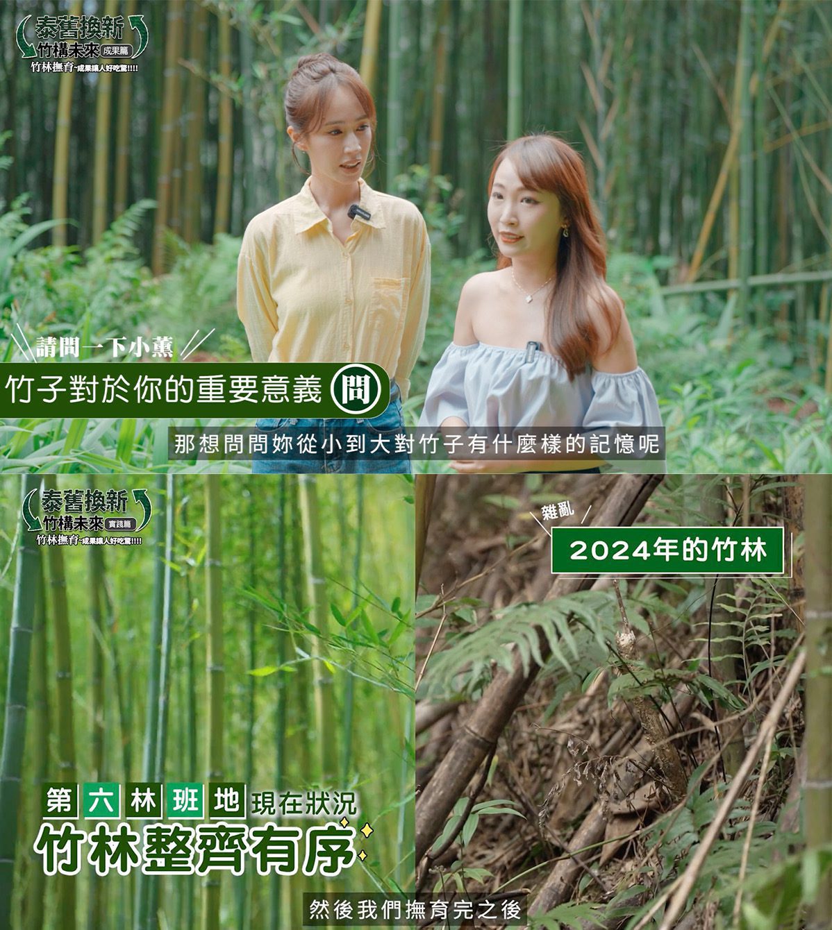 桃園復興區大溪第六林班地,一片翠綠竹林隨風搖曳,這裡是自然生態的一部分,更是中華電信「泰舊換新 竹構未來」計畫的重要舞台。這項涵蓋33.7公頃的四年計畫,不僅守護竹林,也讓青年有機會返鄉就業,部落文化與永續產業能同時生根。主持人小孟邀請泰雅族藝人小薰一同見證撫育成果,小薰回憶父親曾搭建竹屋、製作口簧琴,母親則常煮竹筒飯去販售,從竹簍到竹器,竹子貫穿了她的成長歲月,更代表了泰雅族人世代相傳的智慧。綽號阿山哥的友順竹業負責人林志仁也笑說:「有泰雅族人的地方,就有台灣的桂竹。」