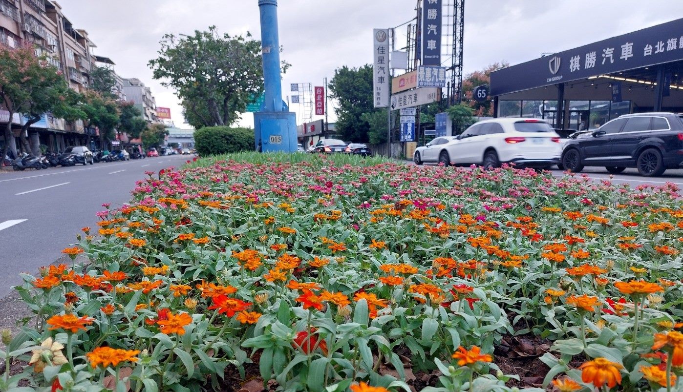 近日在民族東路、松江路等路段已換植百日草,提供民眾全新的視覺饗宴,這些鮮豔的花朵如同城市中的自然畫筆,不僅美化市容,更在忙碌的都市節奏中,悄悄為水泥叢林帶來生命與色彩。