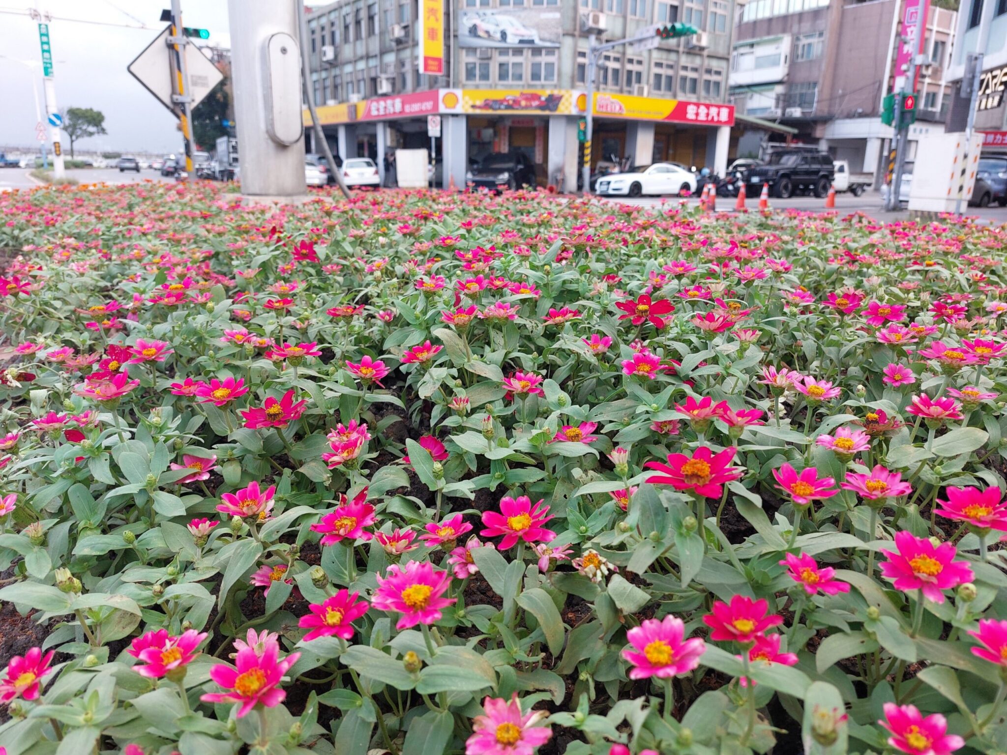 民族東路、靠近濱江市場的道路分隔島上,近日綻放著繽紛亮麗的百日草。公園處表示,為提升都市綠化品質,打破道路冷硬的印象,並為來往行人與駕駛者帶來片刻放鬆的視覺饗宴,部分道路分隔島特別依照花期,輪替栽植不同種類的草花,讓花朵在四季更迭中不斷綻放。