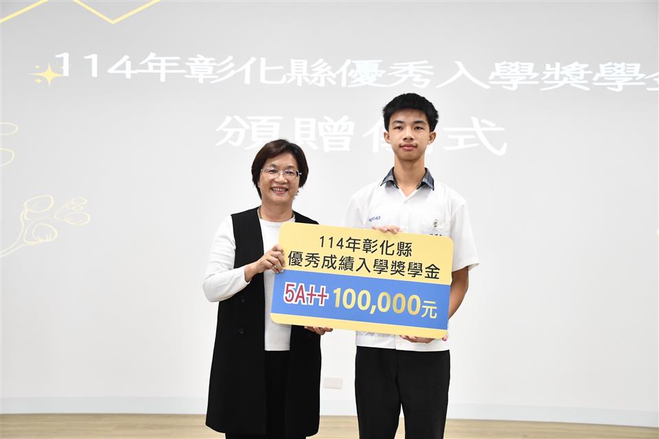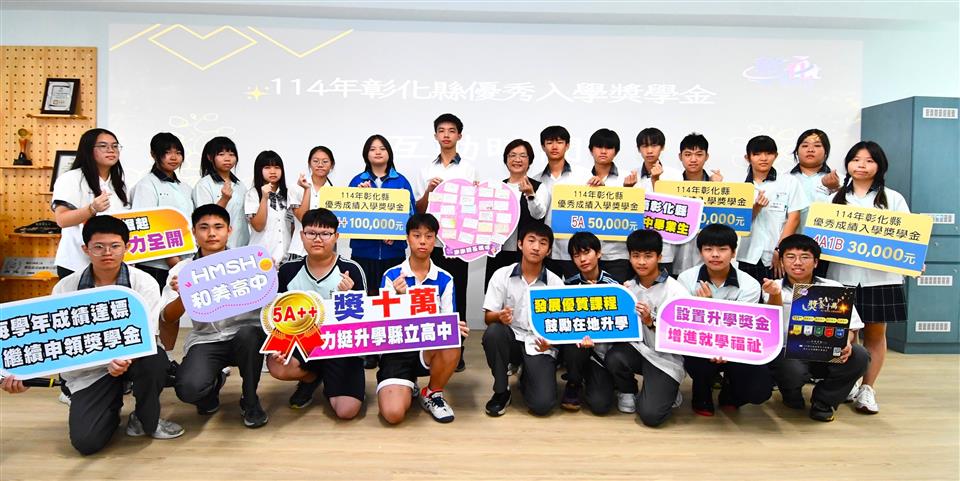 彰化縣政府今(31)日上午於和美高中舉辦「114年度國中會考優異學生獎學金頒贈典禮」,由縣長王惠美親自頒發73萬元獎學金給23位優秀學子。王縣長表示,114學年度共有23名學生符合申請資格,其中5A++(10萬元)1名、5A(5萬元)3名、4A1B(3萬元)10名、3A2B(2萬元)9名,相較去年18位受獎學生增加5位,顯見成功吸引更多優秀學子選擇縣立高中就讀,未來也期盼逐步提升本地升學比例。