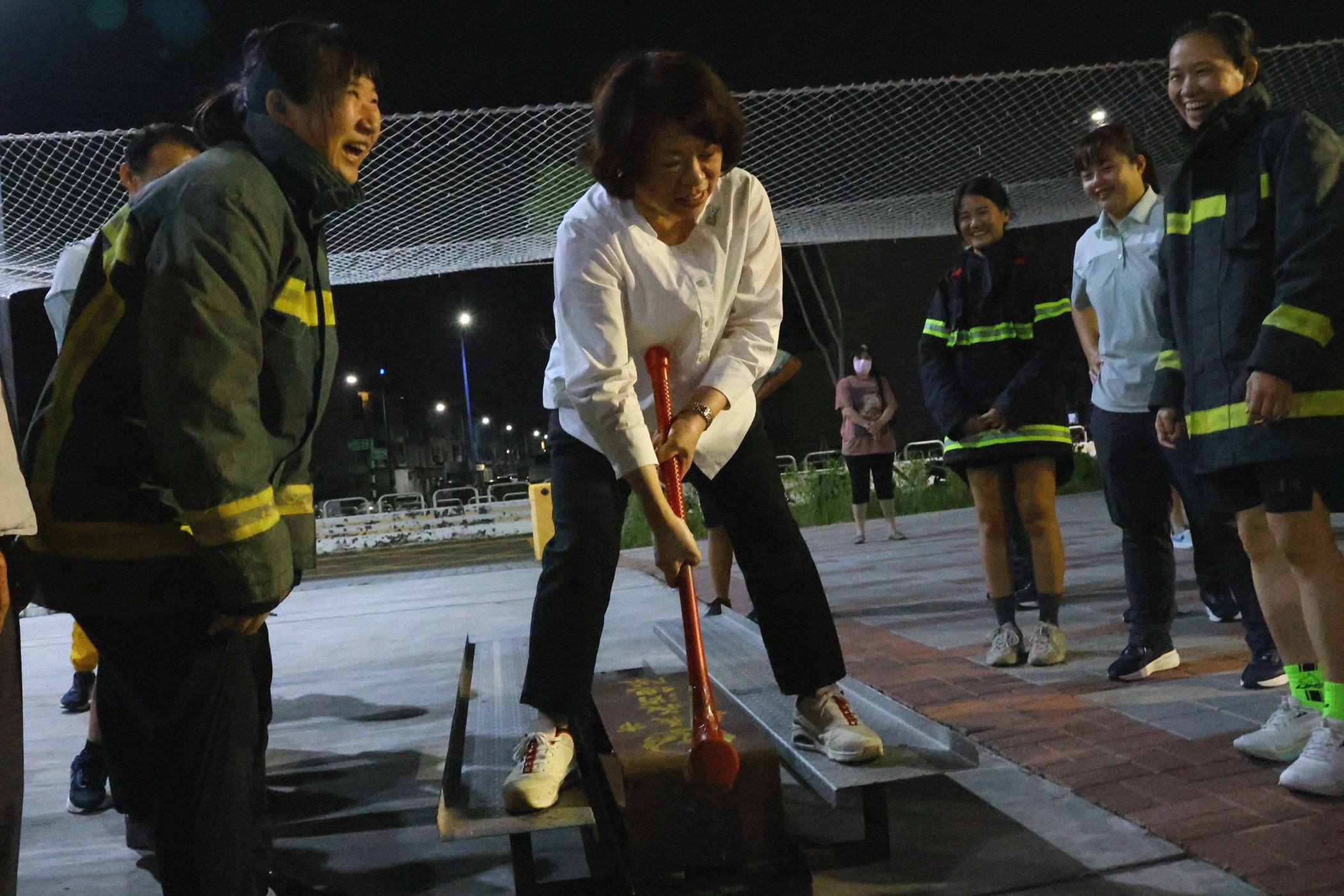 昨日授旗典禮中,特別由女性的參賽隊員演示佈水帶、垂降等項目,展現參賽隊伍平日訓練精實成果。身材纖瘦的隊員不論是要抱起重達70公斤的假人,還是自4樓高空垂降、敲擊重物的演示都一氣呵成,黃敏惠市長看著流暢的演示,為所有成員送上喝采與掌聲。