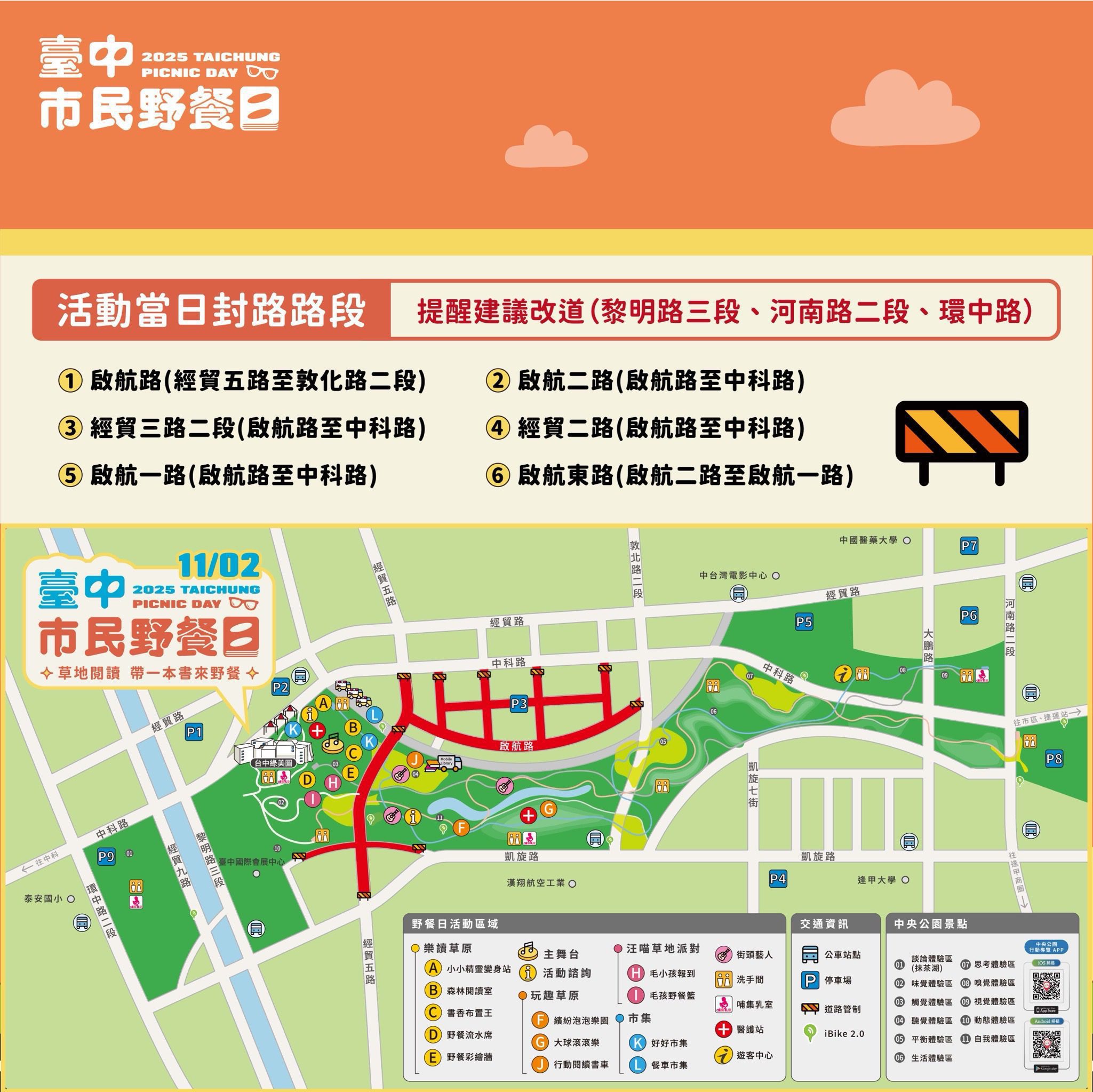 建設局進一步說明,配合主場「中央公園」活動,為維持周邊交通秩序,建設局將分兩階段實施交通管制。第一階段自11月1日晚間8時至翌日晚間6時,封閉西屯區僑大八街及經貿五路部分路段;第二階段自11月2日上午6時至晚間6時,啟航路、啟航二路、經貿三路二段、經貿二路、啟航一路及啟航東路將全面封閉,禁止汽機車通行,僅開放活動車輛及救護車進出。活動期間,警方與義交將於重要路口協助疏導與巡查,並嚴格取締違停,確保活動交通安全順暢。