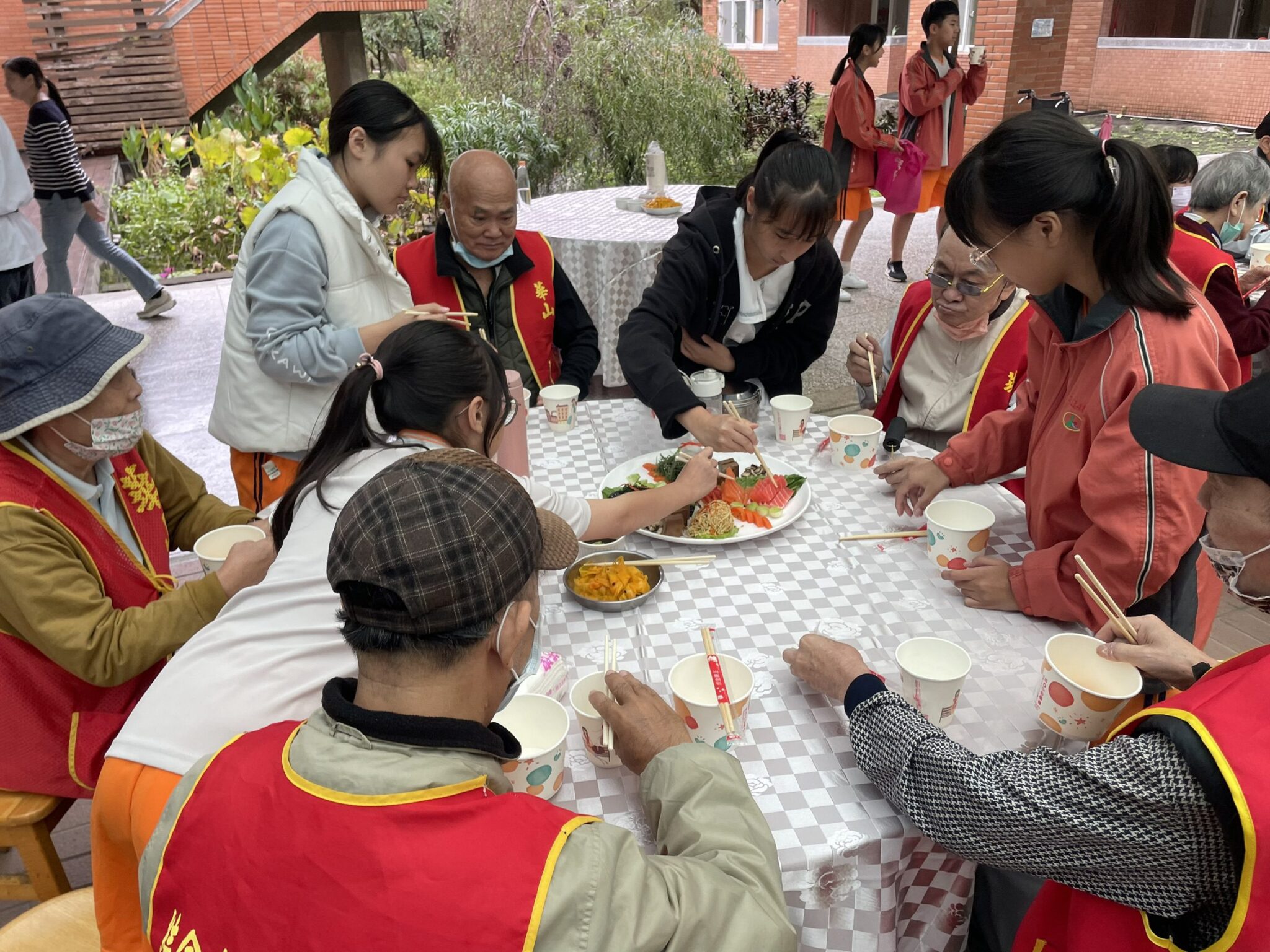 這次與佛光山桃園講堂、華山基金會、中華民國全國義廚聯合會、同濟會、萬能科技大學與會稽國中合作,依據營養師建議設計健康菜單,為30位獨居長輩提供營養團圓餐,並結合40位會稽國中學生志工,共同創造世代同行的溫暖場景,用餐期間由麥克家族公益表演團體進行懷舊歌舞演唱,會稽國中童軍團帶領獨居長者進行闖關互動遊戲。