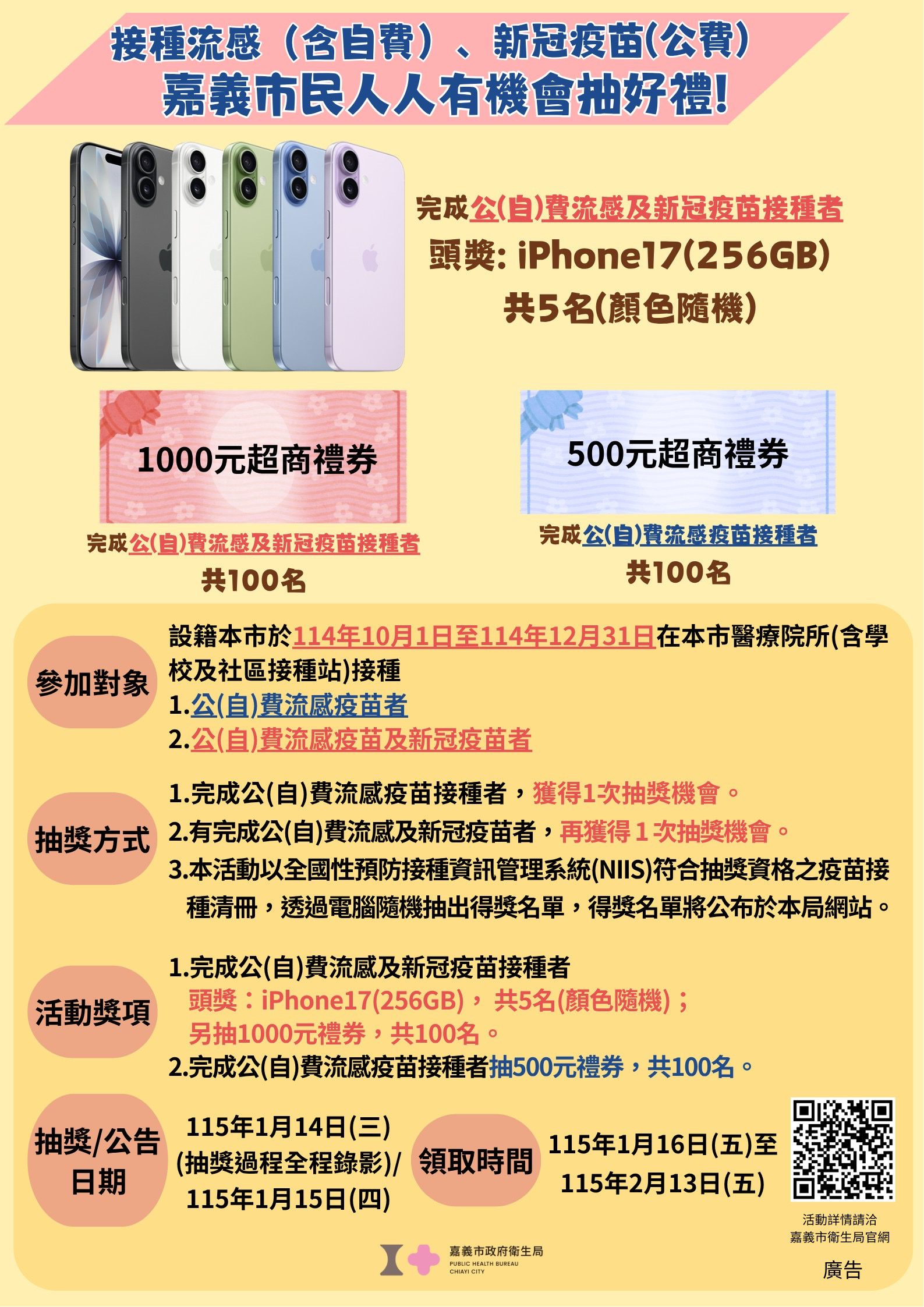 為鼓勵嘉義市市民踴躍接種疫苗,提升自身免疫保護力,嘉義市政府衛生局推出「打疫苗,抽好禮」活動,祭出iPhone 17手機5支,1,000元超商禮券及500元超商禮券各100個名額,本活動以全國性預防接種資訊管理系統(NIIS)符合抽獎資格之疫苗接種清冊,透過電腦隨機抽出得獎名單,抽獎過程全程錄影,得獎名單將公布於嘉義市政府衛生局網站(活動詳情請見宣導單)。